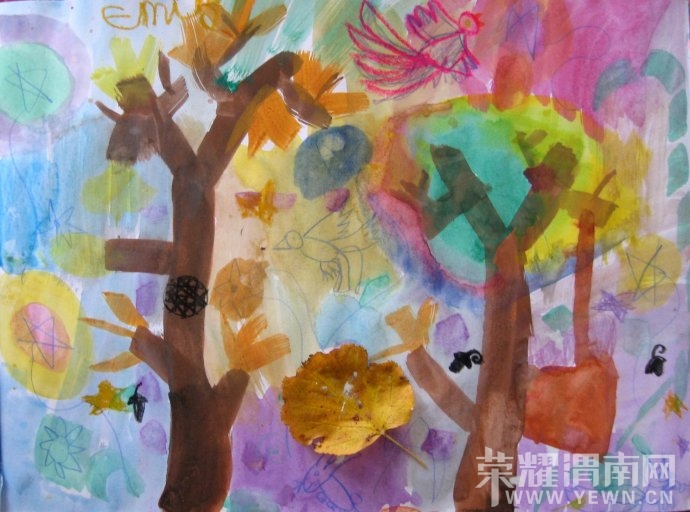 这是五岁小朋友画的秋天,太有创意了,树心居然是空的,小蝴碟可以从那里飞上去.而且色彩用得很美。