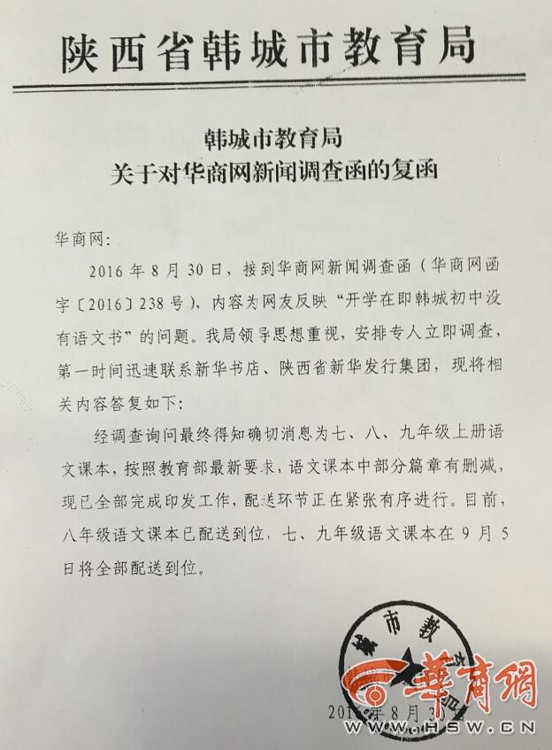 8月30日晚18时左右,韩城市教育局迅速向华商网发来回函答复。回函中表示,在接到华商网的函件后,韩城市教育局安排专人立即调查,第一时间迅速联系新华书店、陕西省新华发行集团。经调查询问得知,确切消息为七、八、九年纪上册语文课本,按照教育部最新要求,部分篇章有删减,现已全部完成印发工作,配送环节正在紧张有序进行。目前,八年级语文课本已配送到位,七、九年级语文课本在9月5日将全部配送到位。 据了解,本次语文课本调整问题并非只涉及韩城市,陕西省内这三个年级的语文课本上册都进行了删减,并按照陕西省新华发行集团的计划分批向全省进行配送,部分地区可能存在不同步情况。因为此前已向广大家长通知提前借去年的旧课本,基本能够顺利过渡开学后至9月5日之前的课程。