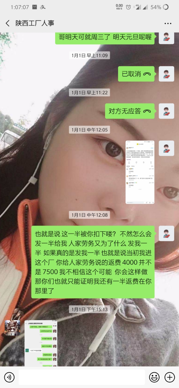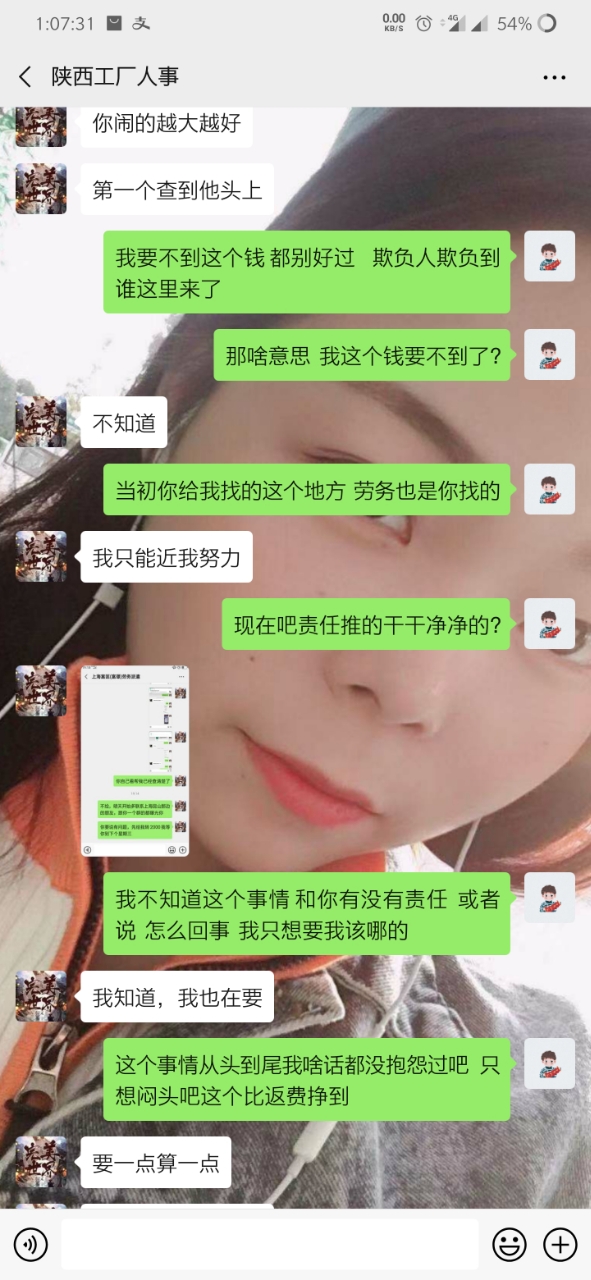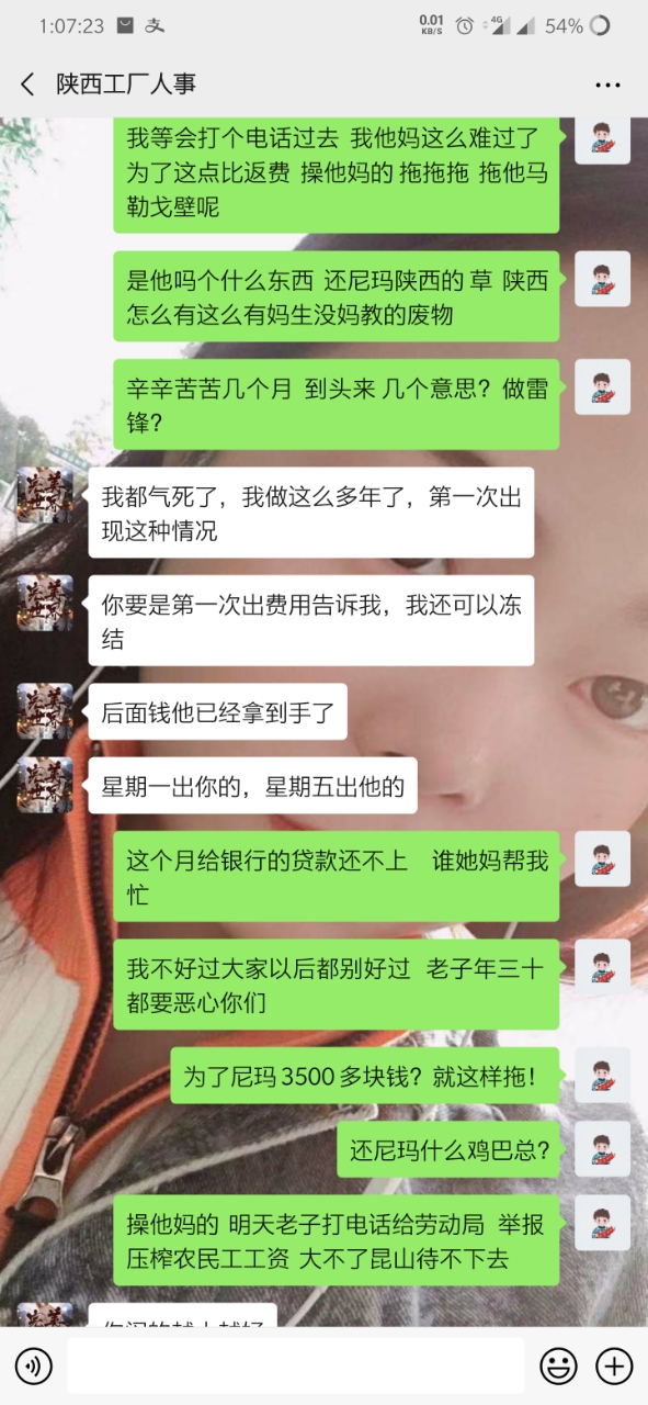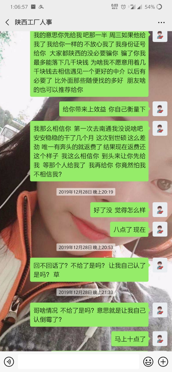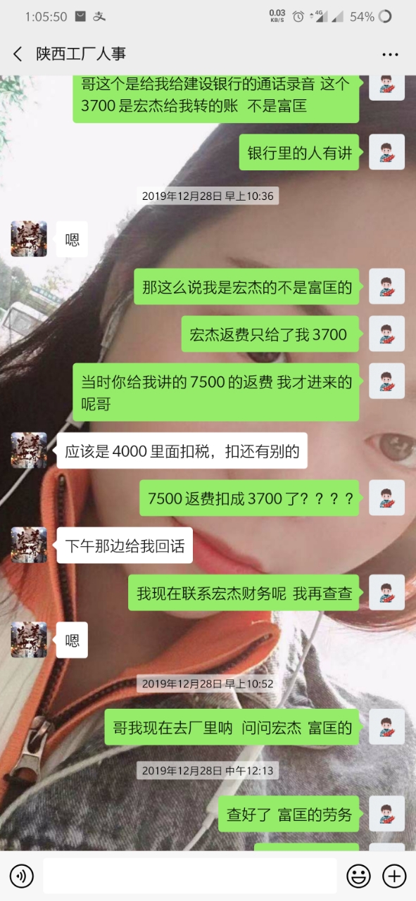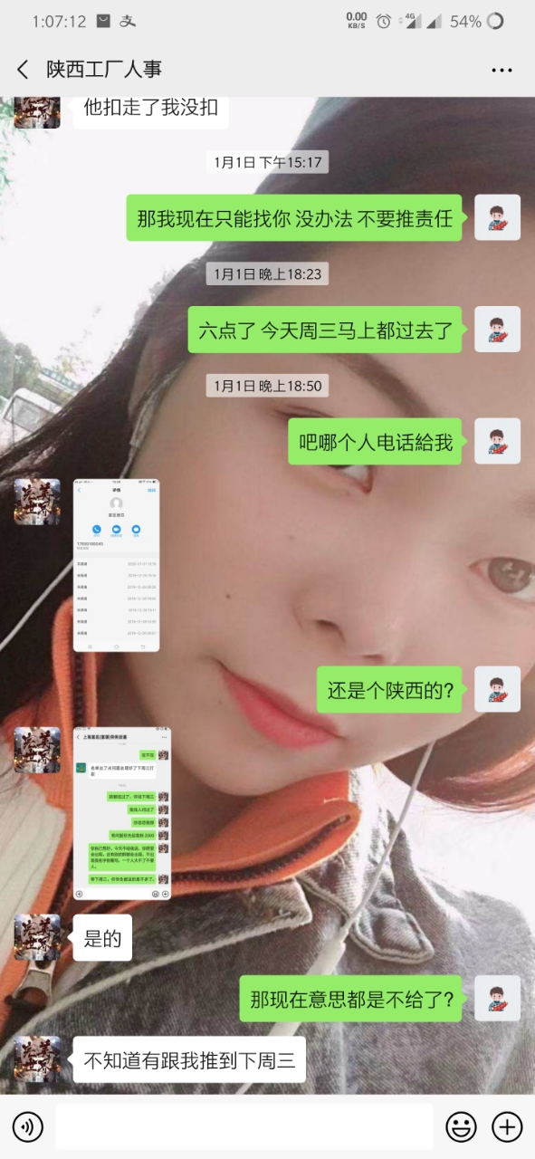 就是因为手上有点账 转返费 走快手上通过一个中介 (等会后面更新他的微信) 到昆山世硕 打卡55天返费7500 去之前讲的比唱的都好听 说什么工资4000左右 但是 事实是 世硕工资一个月最多3000多 这也就算了 毕竟想想还有返费 就这样慢慢熬 中间打卡够55天了 可惜名单迟迟不更新到我(我是九月五号进的厂 名单也是九月五号) 这个事情和今年世硕有关 也就不怪他了 终于走九月五号熬到 12月15号 好像 名单出来了 期盼很久的返费很快就到手 然后总于可以走了 但是但是 打钱的哪天 7500的返费只给了我3700相当于只发了一半 然后我问他 哪个烂人就开始找借口拖 说什么劳务负责的这个人跑了 现在另外一个人接受 让等 反正就是各种办法让你等(看截图你们就明白) 中间有个劳务的人微信加我 现在哪个劳务一声不吭 哪个烂人中介用和哪个劳务的聊天记录搪塞我了很多次 我怀疑 哪个烂人给我的哪个劳务的微信 也是他自己的另外一个号 现在哪个中介烂人说劳务的跑了 但是我后面的人的名单和我是一个劳务的只不过中介不同 人家也顺利拿到了这个返费 也就是说 7500返费给我一半 还有一半被这个中介给吞了 叫这个不得好死的**那去***去了