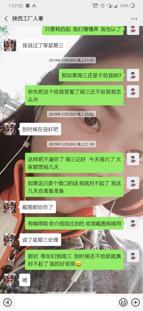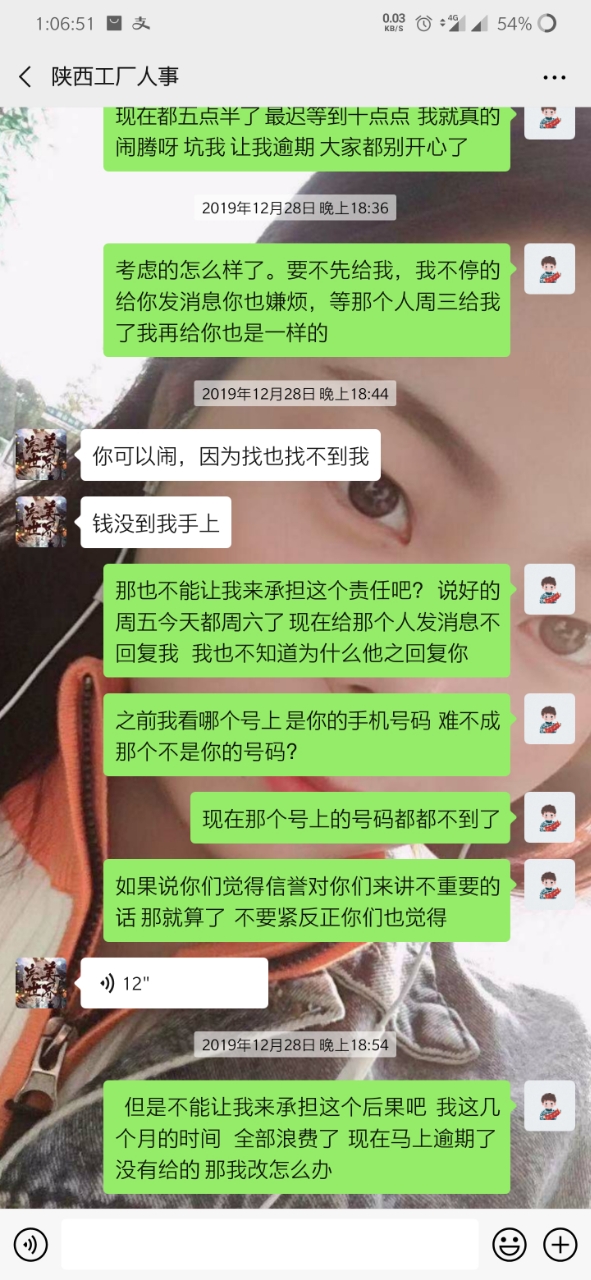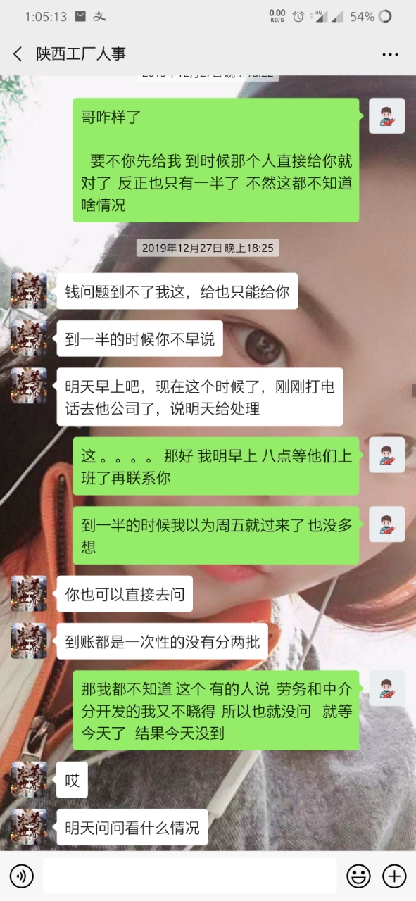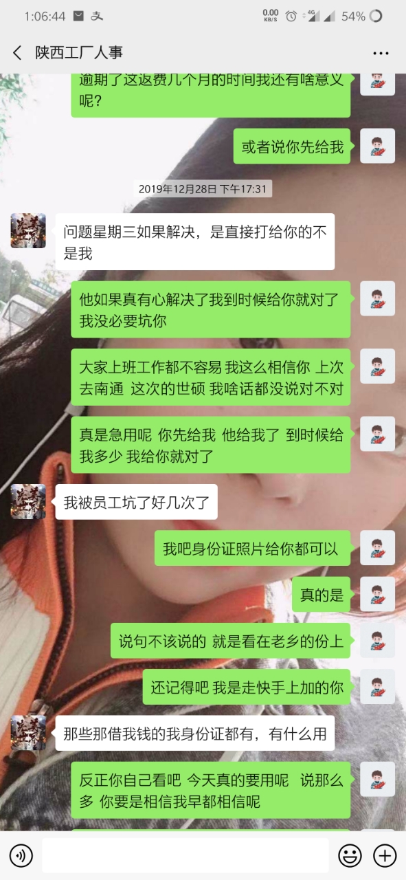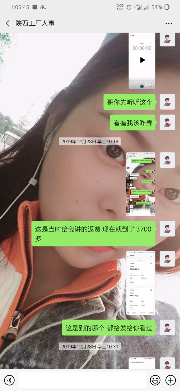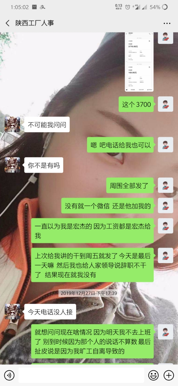 就是因为手上有点账 转返费 走快手上通过一个中介 (等会后面更新他的微信) 到昆山世硕 打卡55天返费7500 去之前讲的比唱的都好听 说什么工资4000左右 但是 事实是 世硕工资一个月最多3000多 这也就算了 毕竟想想还有返费 就这样慢慢熬 中间打卡够55天了 可惜名单迟迟不更新到我(我是九月五号进的厂 名单也是九月五号) 这个事情和今年世硕有关 也就不怪他了 终于走九月五号熬到 12月15号 好像 名单出来了 期盼很久的返费很快就到手 然后总于可以走了 但是但是 打钱的哪天 7500的返费只给了我3700相当于只发了一半 然后我问他 哪个烂人就开始找借口拖 说什么劳务负责的这个人跑了 现在另外一个人接受 让等 反正就是各种办法让你等(看截图你们就明白) 中间有个劳务的人微信加我 现在哪个劳务一声不吭 哪个烂人中介用和哪个劳务的聊天记录搪塞我了很多次 我怀疑 哪个烂人给我的哪个劳务的微信 也是他自己的另外一个号 现在哪个中介烂人说劳务的跑了 但是我后面的人的名单和我是一个劳务的只不过中介不同 人家也顺利拿到了这个返费 也就是说 7500返费给我一半 还有一半被这个中介给吞了 叫这个不得好死的**那去***去了