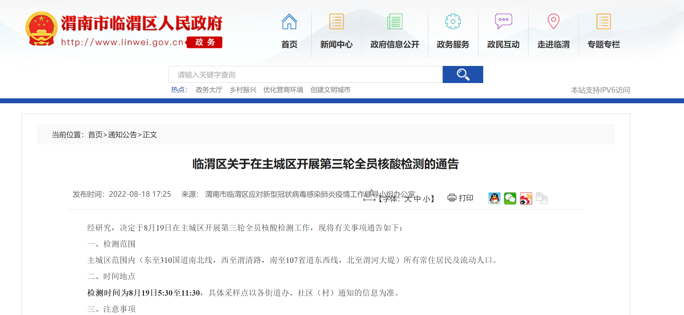 经研究,决定于8月19日在主城区开展第三轮全员核酸检测工作,现将有关事项通告如下: 一、检测范围 主城区范围内(东至310国道南北线,西至渭清路,南至107省道东西线,北至渭河大堤)所有常住居民及流动人口。 二、时间地点 检测时间为8月19日5:30至11:30,具体采样点以各街道办、社区(村)通知的信息为准。 三、注意事项 1、全员核酸检测期间,主城区范围之外的人员非必要不进城区,确需进入城区的,请提前就近核酸检测,持24小时核酸阴性证明进入。若因突发疾病、意外受伤等情况需进入主城区的人员,可联系120、110予以保障。 2、完成采样后,将现场发放“临渭猕猴桃”标识贴,所有小区、单位、公共场所将查验标识帖,无标识帖人员不得出入小区、单位,不得进入公共场所,不得乘坐公共交通工具。 3、请广大居民提前注册个人电子码,或准备纸质二维码,采样时携带身份证,做好个人防护,全程佩戴口罩,保持一米距离,不扎堆、不逗留、不插队、不传谣。 4、未满16周岁或患有疾病的人员,须由监护人陪同采样;行动不便的特殊人群,以及从海南、浙江、新疆、西藏四省来返临渭人员,居家隔离、居家健康监测人员,提前向社区(村)报备后上门采样。有发热、咳嗽等症状的人员,请做好个人防护,及时到医院发热门诊采样就诊。 5、为最大程度减少人员聚集,请广大群众继续大力支持配合,错峰有序,按时参加检测。采样时请耐心等待,相互礼让,照顾好老弱病残孕等特殊群体。 6、近期天气炎热,请注意防暑降温。本次全员核酸检测结果可在“陕西一码通”查询检测结果。 本次全员核酸检测按照“不漏一户、不漏一人”的原则,做到应检尽检。所有小区、单位、公共场所,必须查验核酸检测标识帖。对故意不参加、不配合、扰乱公共秩序、制造传播谣言、妨碍采样工作的人员,以及不查验核酸检测标识帖的单位,将依据有关法律法规由公安机关追究法律责任。 渭南市临渭区应对新型冠状病毒感染 肺炎疫情工作领导小组办公室 2022年8月18日