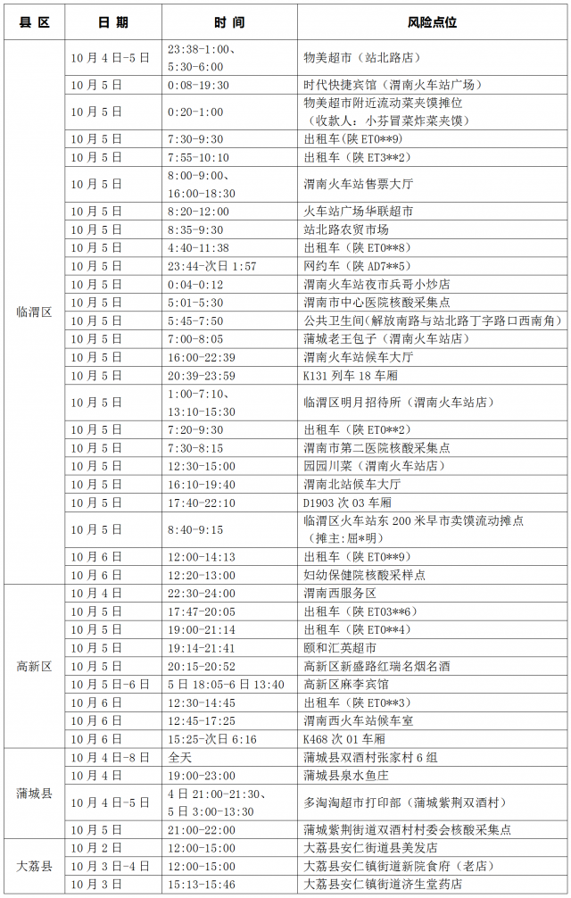 根据渭南市应对新型冠状病毒感染肺炎疫情工作领导小组办公室(流调工作专班)流行病学调查,现将外省协查阳性人员及我市新增阳性感染者风险点位(活动轨迹)公布如下: