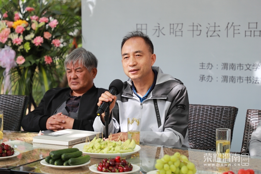 陕西省政协文史和学习委员会副主任、中国书协会员、中华诗词学会会员陈俊哲,渭南市文学艺术界联合会主席张力,渭南市书法家协会主席薛小虎,中国书法家协会第四、五、六届学术委员会委员,第七届隶书委员会委员,第八届隶书委员会副主任吴振锋,中国书法家协会第七届理事,陕西省书法家协会第四届副主席兼秘书长,陕西省作家书画院副院长史星文,中国书法家协会理事,第四届评审委员会委员,第五、六届楷书委员会委员,第七、八届行书委员会委员,陕西省书法家协会副主席,西安交通大学博士生导师薛养贤,中国书法家协会第四届评审委员会委员,第五、六、七、八届行书委员会委员,陕西省公安文联常务副主席兼秘书长遆高亮,陕西书画院秘书长、陕西太白书院副院长兼秘书长、关雎诗社顾问马河声,中国书法家协会会员、北京市西城区书法家协会副主席杨陌,中国书法家协会会员、中国电力行业书法家协会副主席、陕西省书法家协会理事,行书委员会副主任张鉴宇,中国书法家协会会员、陕西省书法家协会理事、西安市青年书法家协会副主席刘建设,渭南文学书画艺术界知名人士丁文德、李康美、祁吉寿、郑俊海、柏峰、梁振林、郭巍、刘百宽、殷满仓、王旺山、徐红林、权佩亮、张长久、殷晓克、释法光,以及渭南市书法家协会、美术家协会部分主席团成员等60余位领导嘉宾、专家学者,观摩了田永昭书法作品展,就《田永昭书法作品集》的出版发行展开了深入座谈。活动由渭南市书法家协会副主席兼秘书长陈龙主持。