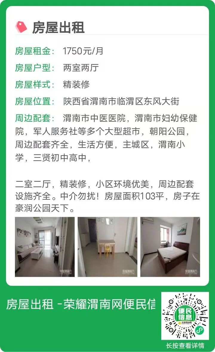 (点击或长按图片查看详情) ▼【08 房屋出租】 房屋租金: 1750元/月 房屋户型: 两室两厅 房屋样式: 精装修 房屋位置: 陕西省渭南市临渭区东风大街
