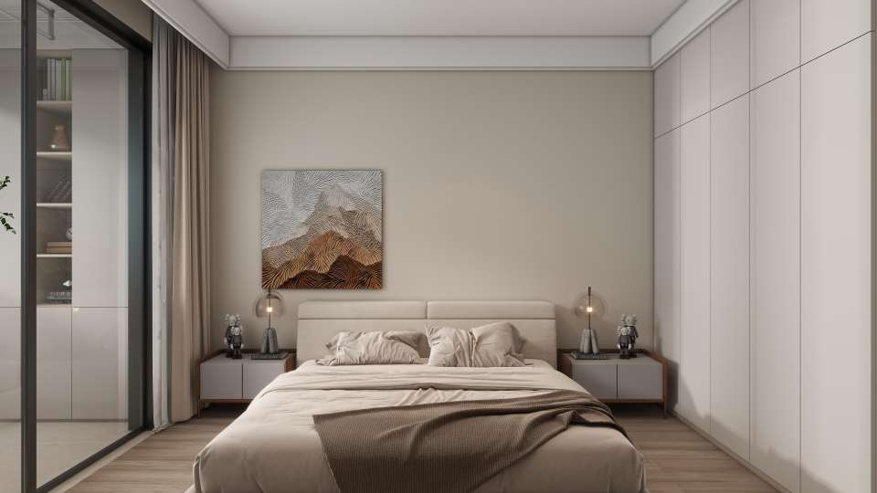 主卧浅咖色软包床搭配同色系床品, 温柔又静谧