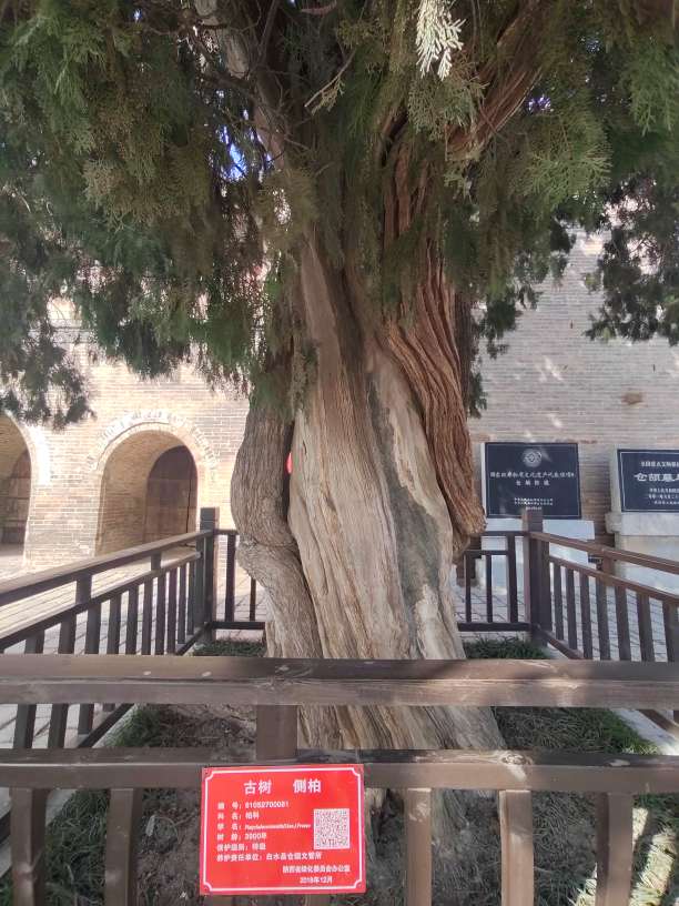 我十分幸运地见到了那棵传说中由仓颉亲手栽种的古柏。这棵侧柏已有5000多年历史,高16米,腰围7.8米,根围9.9米,被称为“手植柏头在云里插”。它苍劲挺拔,虬枝盘曲,树皮上的纹路如黄河奔涌,历经千年风雨依旧生机盎然,在2020年还萌发出了新的枝桠。