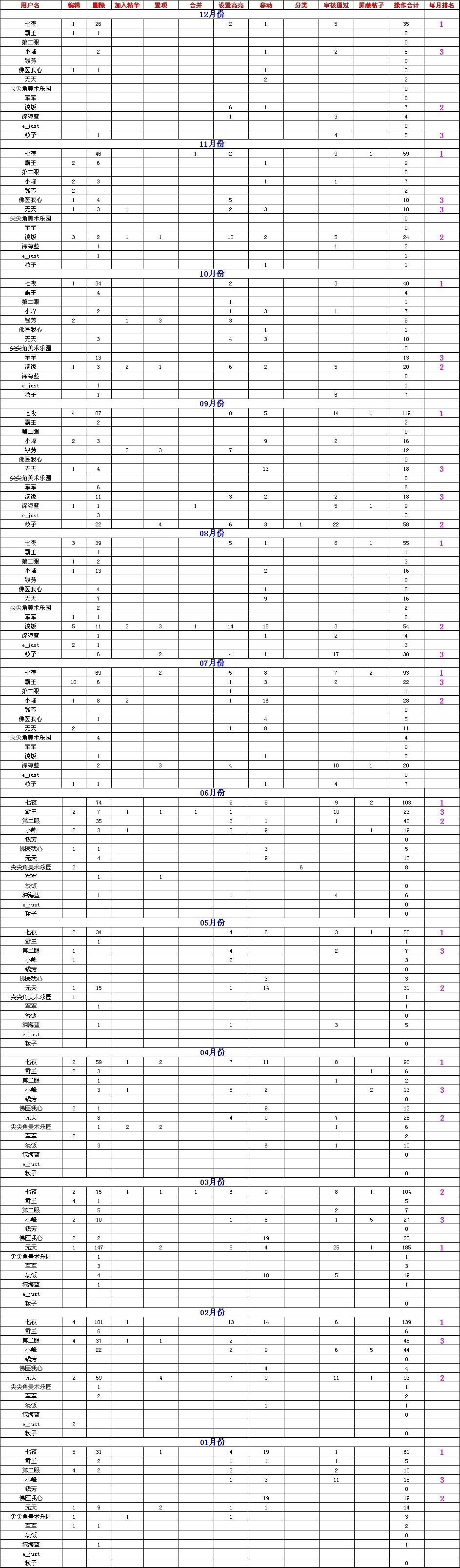 七夜:除3月操作记录排名第二,其余11个月均为第一。 小峰:第1、3、4、12月排名均为第三。 淡饭:第8、10、11、12月排名第2,9月排名第三。 佛医我心:11月排名第三,1月排名第二。 无天:2、4、5月排名第二,3月排名第一,9、11月份排名第三。 军军:10月排行第三。 籹子:9月排名第二,8、12月排名第三。 霸王:6、7月份排名第三。 第二眼:2、5月份排名第三,6月排名第二。