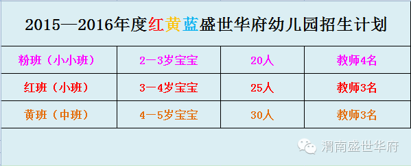 红黄蓝幼儿园是红黄蓝教育机构旗下的知名幼儿教育品牌,目前在全国拥有300多家高品质幼儿园,成为众多优质社区和地产项目的首选幼儿教育合作伙伴。2015年红黄蓝幼儿园与盛世华府小区成功携手,致力于打造渭南首家国际化标准幼儿园区。 好 消 息 1、即日起至8月25日报名即可享受交500元抵2000元优惠,名额有限,先报先得。 2、红黄蓝盛世华府幼儿园定于8月23日上午在桃园美莎国际酒店举办专家讲座,欢迎您和宝宝莅临! 园所地址:盛世华府小区(乐天大街与仓程路十字北200米) 报名电话:18291359492(高老师) 13571953309(张老师)