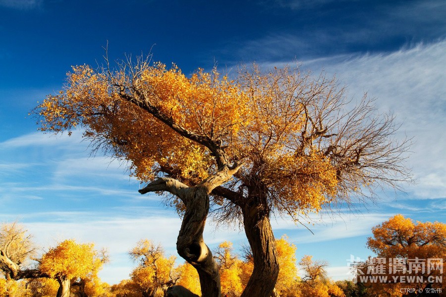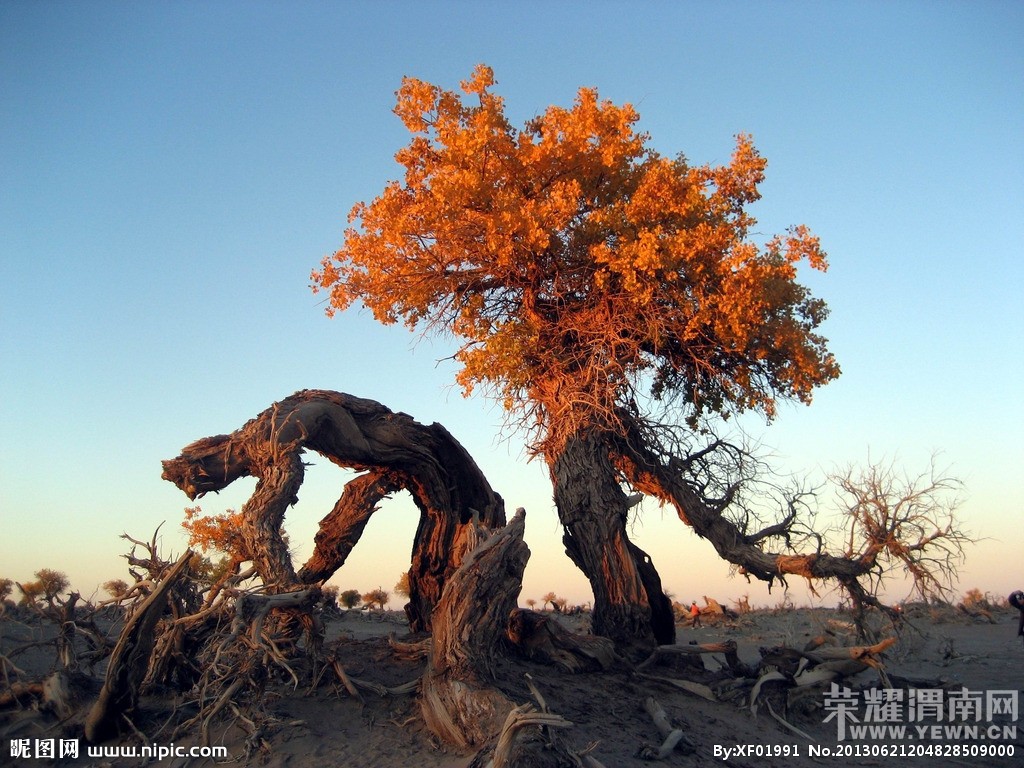 胡杨是中亚地区唯一适合生长的乔木,它是大自然漫长进化过程中幸存下来的宝贵物种。它妩媚的风姿、倔强的性格、多舛的命运激发人类太多的诗情与哲思。古往今来,胡杨已成为一种精神而被人们所膜拜。 弱水河畔、居延海边是胡杨的故乡,这里的39万亩胡杨林是当今世界仅存的三处天然河道胡杨林之一、是阻止巴丹吉林沙漠向北扩散的重要屏障,是中国西部生态的天然宝库。