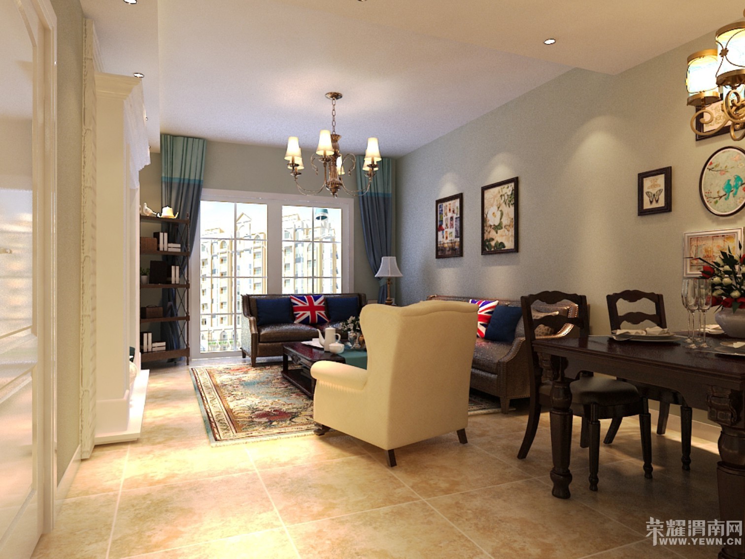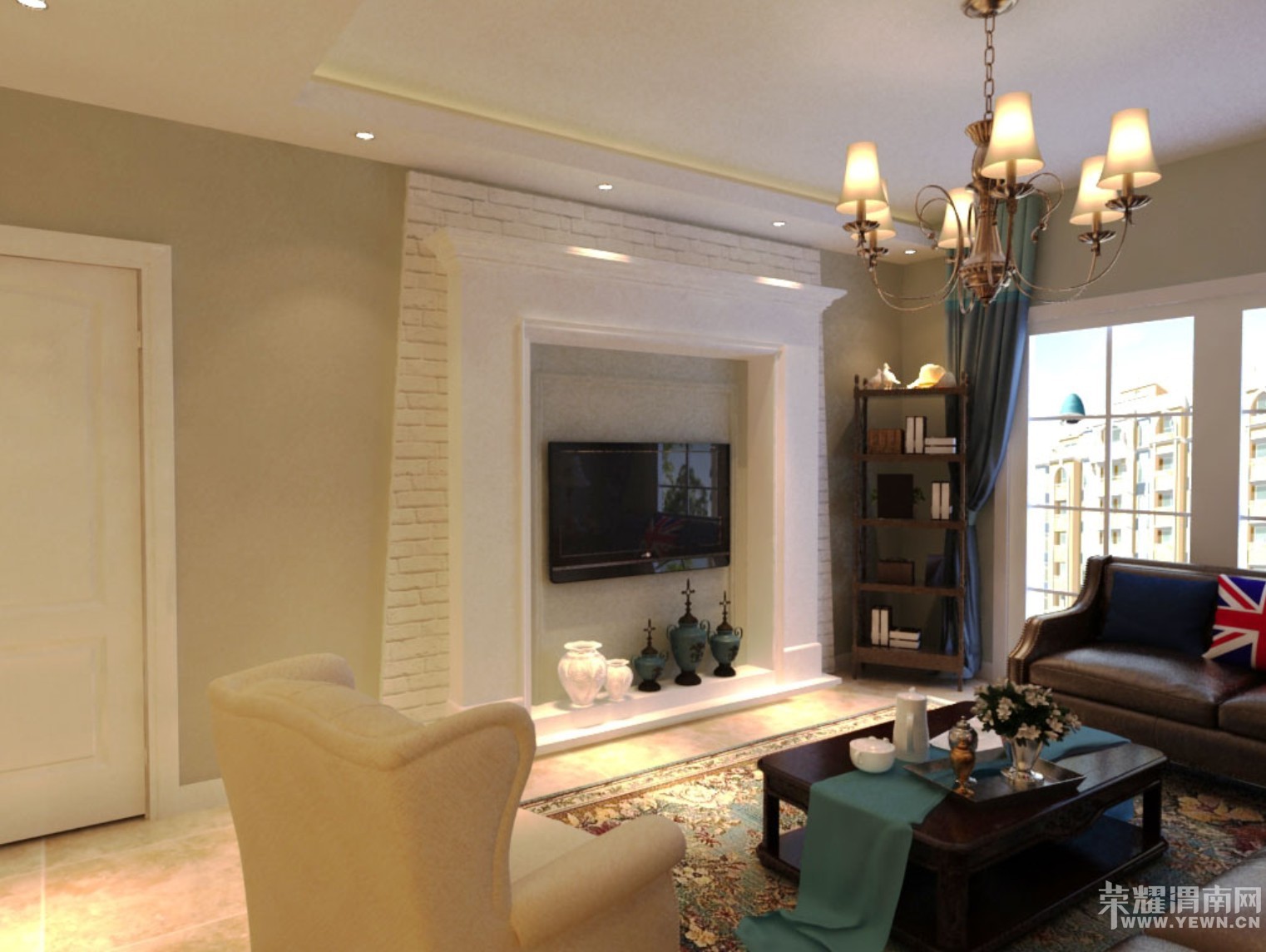美式乡村风格追求自然、朴实的古典风格。居室色彩主调为淡绿色。家具、门、窗漆成白色。电视墙采用美式壁炉造型做烘托,与餐厅造型相呼应,美国人喜欢有历史感的东西,这不仅反映在软装摆件上对仿古艺术品的喜爱,同时也反映在装修上,所以地面采用仿古墙地砖铺贴,使空间环境多表现出华美、自然、古典的气氛。