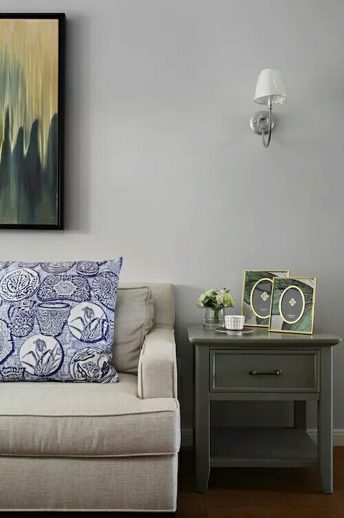 在原有的基础上,重新给墙面涂色,沙发墙上左右各添置了一个白色壁灯,增加了空间的明亮度,简单的款式灵动又不失优雅。
