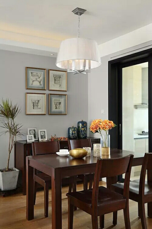 餐厅悬挂着的装饰画,金色镶边,与桌面上极具金属感的一件件精致小物、花瓶里的橘红色花束相得益彰。