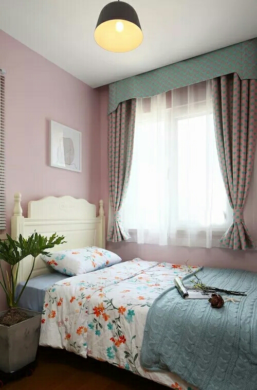 儿童房,乳胶漆和窗帘的颜色交相呼应,特意用了两层窗帘,布艺窗帘增添高甜度少女感,白色薄纱帘则仙气十足,在白天在夜晚都与柔和光线融为一体,透着皎洁的明亮。
