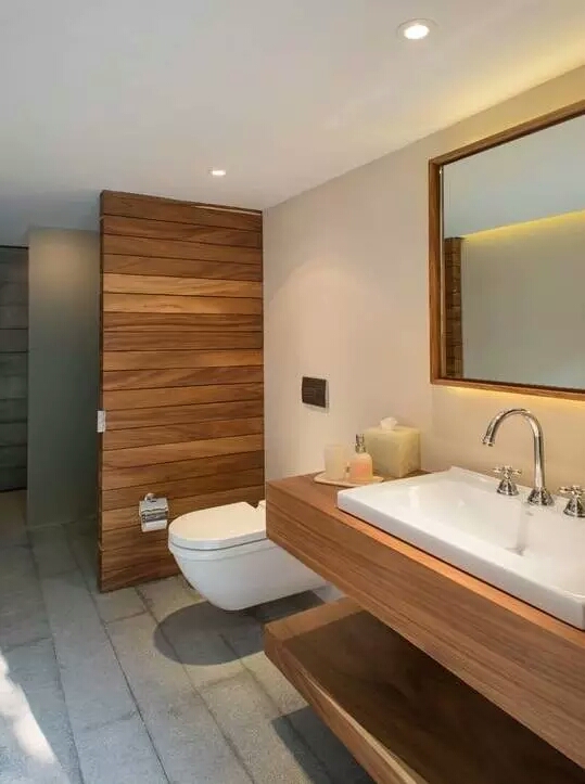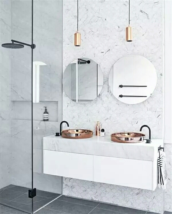 除了可以在门上下功夫,洗手台、面盆之类的装修,也可以做到干湿分离。重要的一点就是要不!能!落!地!不接触到水渍的浴室家具,受到腐蚀的几率降低,增加了使用寿命,同样也便于清洁打扫。