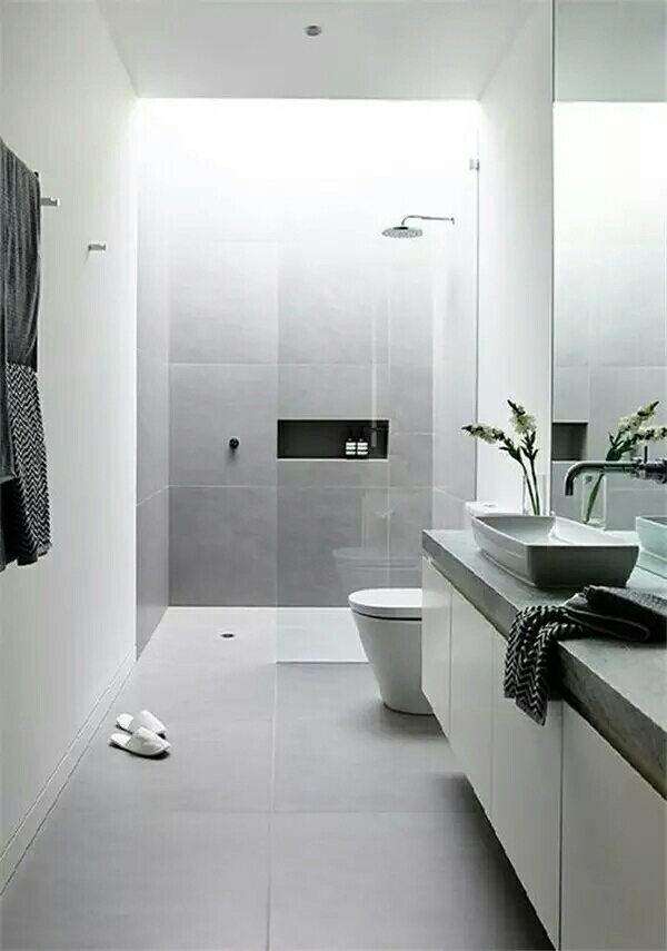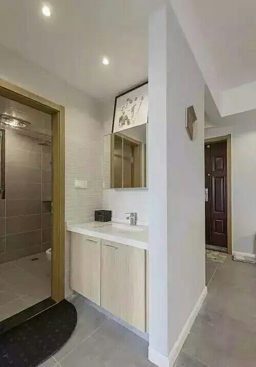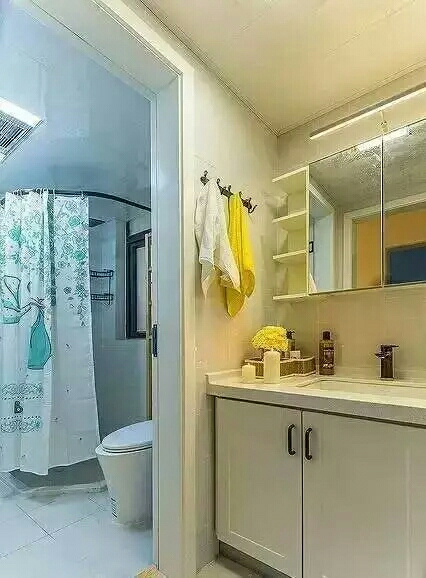 如果这些都不喜欢的话,可以试着将卫生间一分为二,洗面台和水池放在浴室的外面。完全隔绝了洗澡时的水气。但是所占空间略大,小户型不建议采用这种方式。