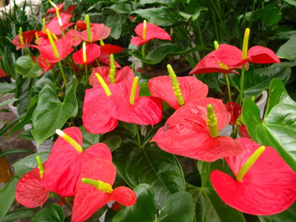 红掌 学名:Anthurium andraeanum 别名:花烛、安祖花。 科属:天南星科花烛属。 产地及分布:原产于南美洲热带雨林中,现用有光、温、水调节系统的大棚作切花栽培。云南无霜热区用简易荫棚也栽培出了很好的切花和盆花。随着经济水平的提高,红掌作为一种高档花卉的应用前景良好。红掌的花朵独特,佛焰苞明艳华丽,色彩丰富,极富变化,且花期长,四季开花不断,瓶插寿命很长,水养期可达1个月,盆栽单花期可达4~6个月。 形态特征:多年生附生常绿草本花卉。株高可达1米,节间短。叶自根茎抽出,具长柄,单生,长圆状心形或卵圆形,深鲜绿色,有光泽。花芽自叶腋抽出,佛焰直立开展,革质,正圆状卵圆形,橙红或猩红色。其变种品种有佛焰苞乳白色、镶嵌白绿色、五彩色和有精巧红边之品种,极富变化。肉穗花序无柄,圆柱状,直立,略向外倾。花两性,花被具四裂片,雄蕊4,子房2室,每室具1~2胚珠。小浆果内有种子2~4粒,粉红色,密集于肉穗花序上。 生态习性:喜空气湿度高而又排水通畅的环境,喜阴、喜温热。在白天温度不高于28℃,夜间不低于20℃的环境中可终年开花结果,高于35℃将产生日灼,低于14℃则生长受影响,低于0℃的持续低温将冻死植株。要求空气湿度达80%,土壤pH值为5.5,Ec值在1.2为宜。要求土壤疏松、肥沃,最好进行无土栽培。