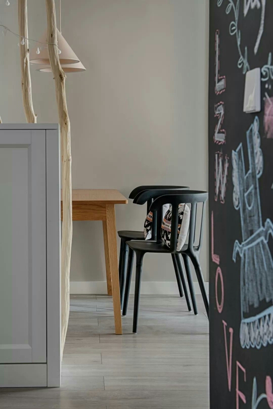 客厅特别设置了休憩区,搭配原木系高脚凳,配上黑板手绘小图,让客厅的功能作用更加丰富。