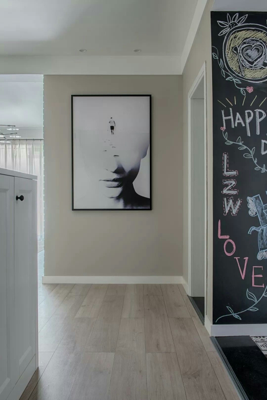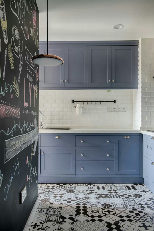 在简洁的装饰中添加满墙黑板手绘画和拼花地砖,赋予小宅清新自由的流通感。
