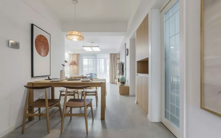 餐厅的木线条吊灯提升了整个餐厅空间的层次感,原木色的家具与青花瓷具相得益彰。