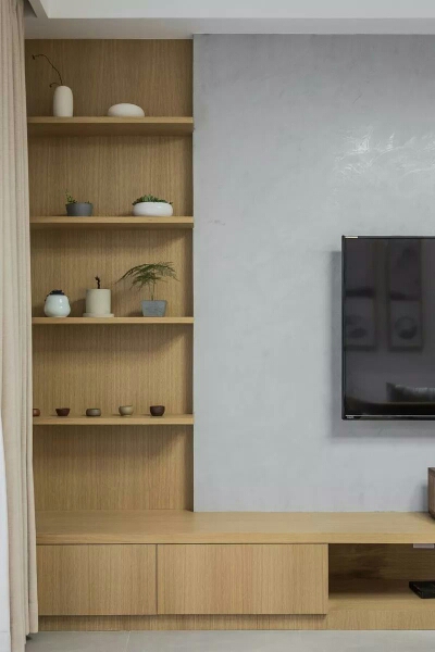 电视背景墙左侧设计了数层装饰隔板,都为业主喜爱的创意摆件提供了展示便利;右侧则采用了不对称美学,干净整洁的花瓶时装摆件,让想象的空间无限延伸。