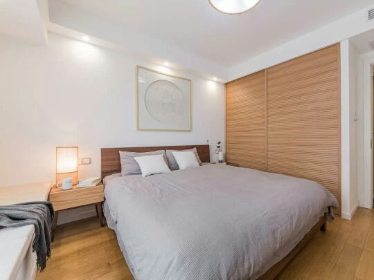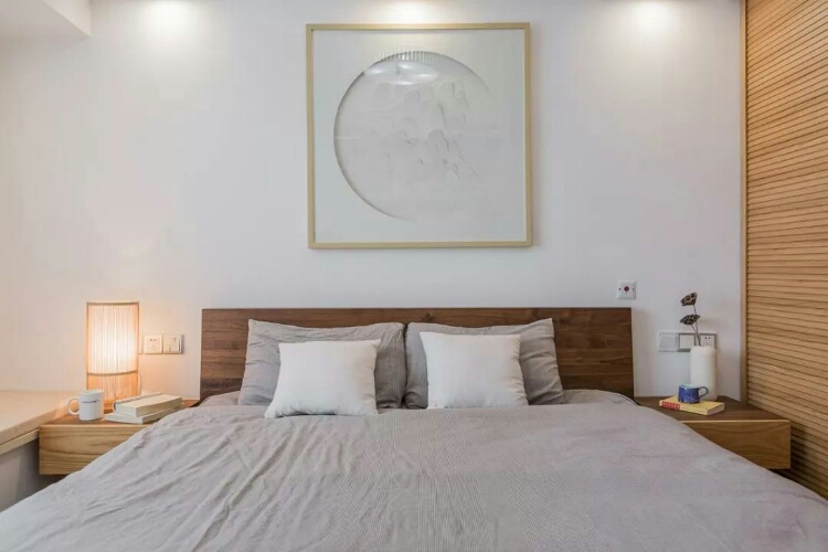 整体设计偏日式风格,自然简约的原木家具,舒适素静的软装,以及富有禅意的装饰画与摆件,整体自然而富有诗意。