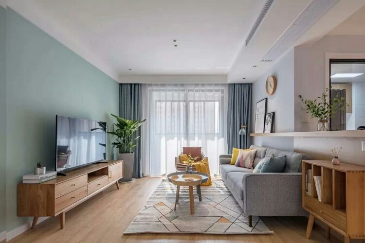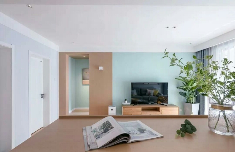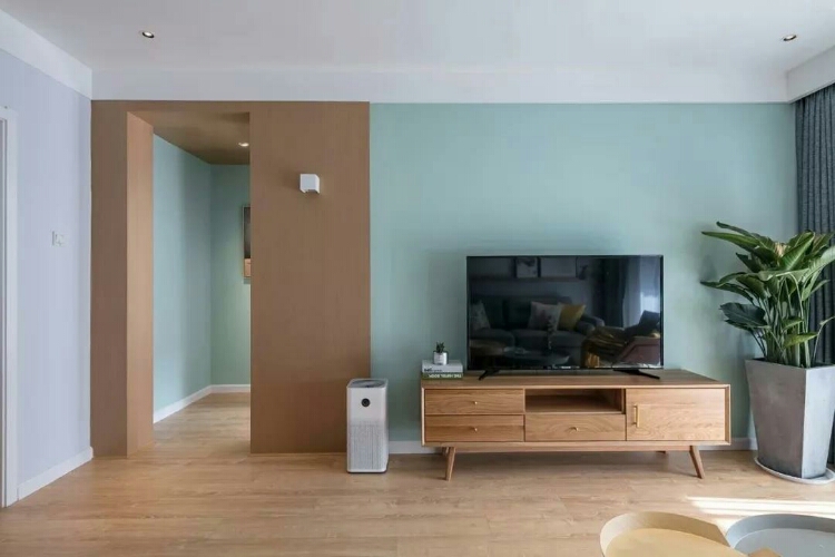 电视墙木色+淡蓝色的乳胶漆,搭配电视柜与一旁的绿植,显得格外的自然清新。