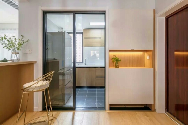 进门右手边是入墙式的鞋柜,中间留空+藏光的设计,显得美感十足。而大门对着的位置则装了个小吧台,上面摆着一盆小绿植,让人一进门就感受到一股自然清新的味道。
