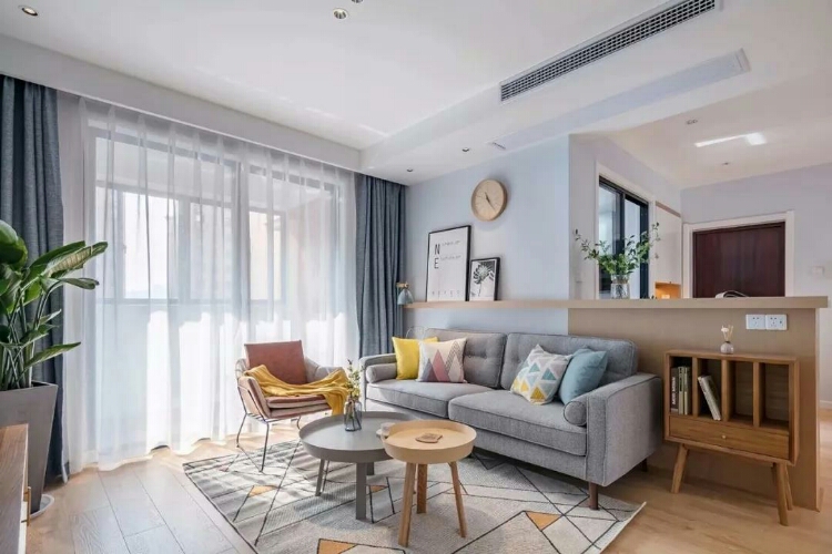 沙发墙上连着吧台装了一块搁板,一套现代舒适的布艺沙发,结合2个圆形的小茶几,充满了轻松的北欧气息。