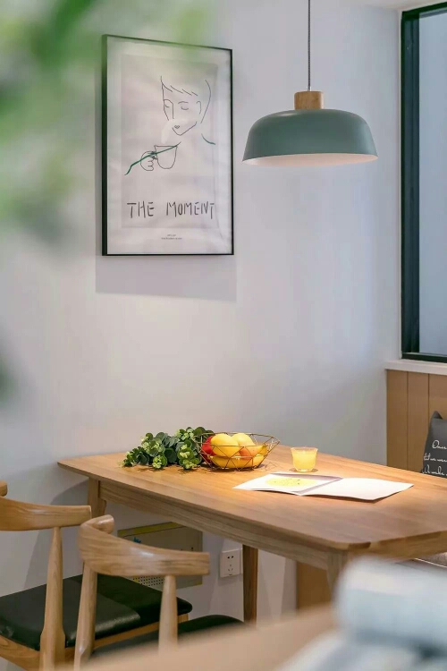 餐厅,极简的木质餐桌椅,墙面上一幅简约装饰画,并搭配文艺的吊灯,让用餐氛围更加优雅自然。