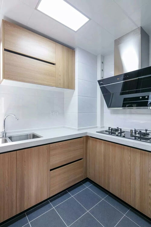 厨房木色橱柜搭配白色的墙面砖,干净又自然。