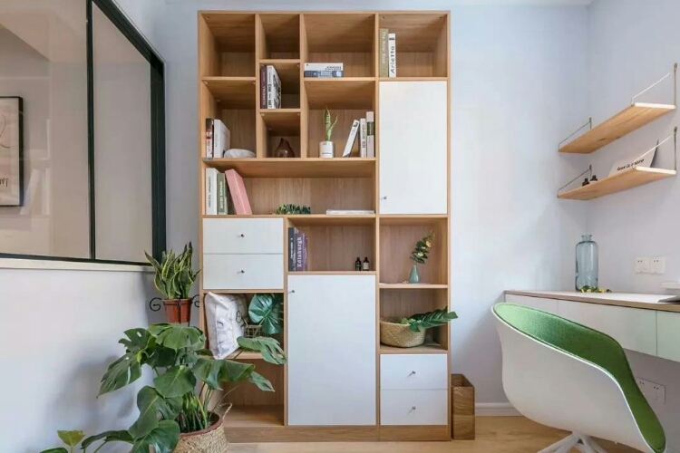 书房的书桌靠窗设计成了悬空式的,窗两侧的墙上装着搁板,旁边则设置了书架+展示柜,摆上书籍与装饰品,点缀出一个温馨浪漫的小书房。