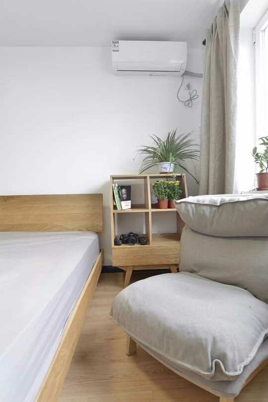 主卧同样在极简的空间基础下,床头白了一个展示架作为床头柜,同时摆了一张懒人沙发,在闲暇之余,可以躺着看书玩手机。
