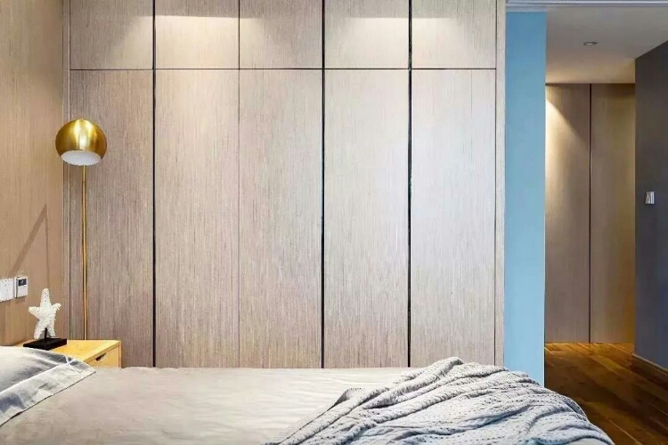 麻灰色的衣柜靠着蓝色的墙面,无把手的柜门显得格外的干净利索。