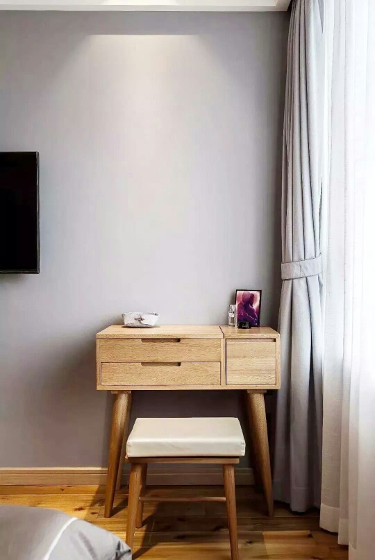 梳妆台设置在了靠窗的位置,利用白色的椅面避免了统一木色形成的单调感。