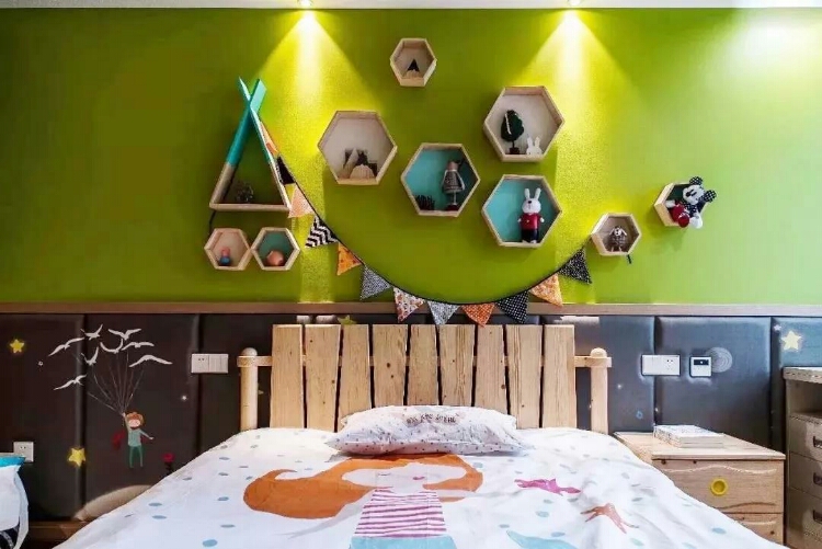 儿童房,草绿色的床头背景做了半墙高的卡通软包处理,配合栅栏式的床头靠背,颇具乡村式的清新惬意。