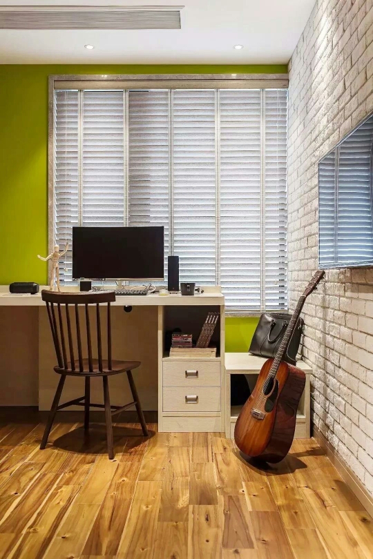 靠窗放了一张书桌,开放的空间让取放变得更为方便。书桌旁边还有一个小矮柜,营造了错落的桌面,让物品的放置显得更加有序。
