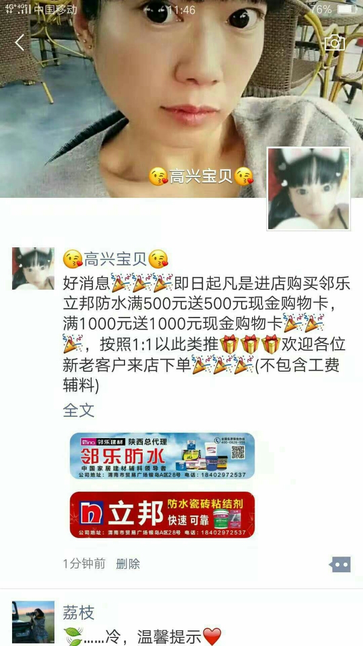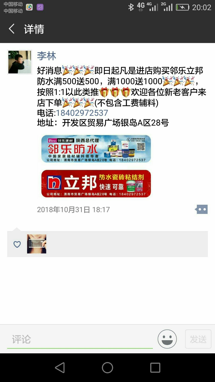 好消息即日起凡是进店购买邻乐立邦防水满500元送500元现金购物卡,满1000元送1000元现金购物卡,按照1:1以此类推欢迎各位新老客户来店下单(不包含工费辅料)