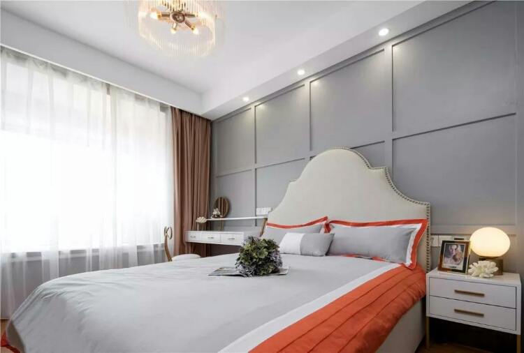 布艺床,精致铆钉外加网红书桌椅,简单而有质感,也增加了家居生活的灵动性。