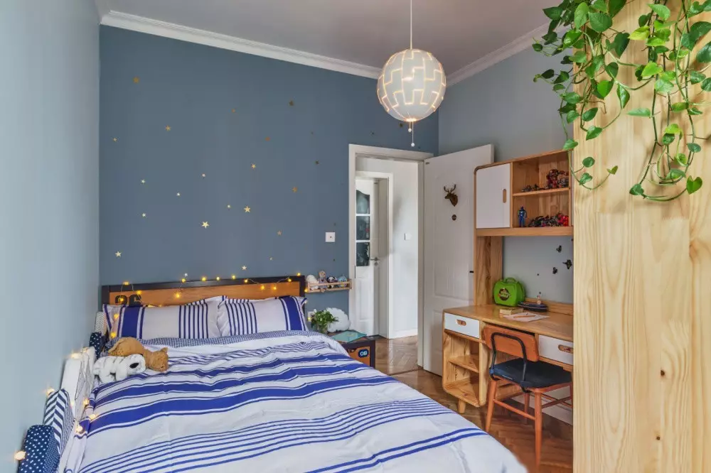 儿童房以蓝白两色为主调,配以宜家网红吊灯以及梦幻的星星灯,带来自由与灵动的气息。屋内全部采用成品家具,以后可以进行灵活机动的调整。
