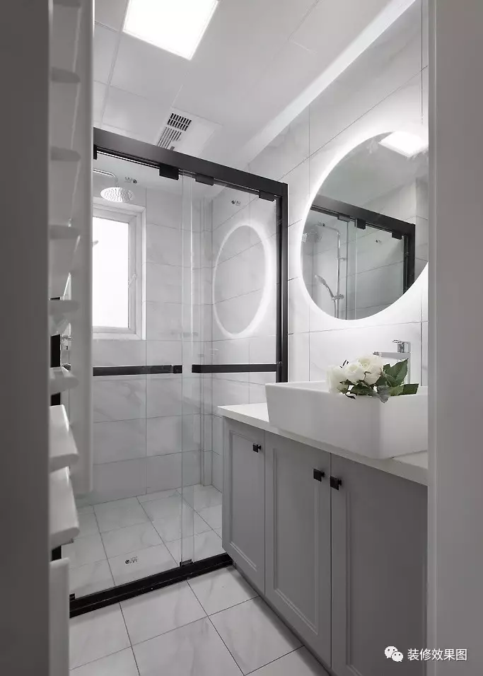 卫生间以简约的灰白色为主调,加以清新花艺与灯光的点缀,散发着低调而优雅的气息。
