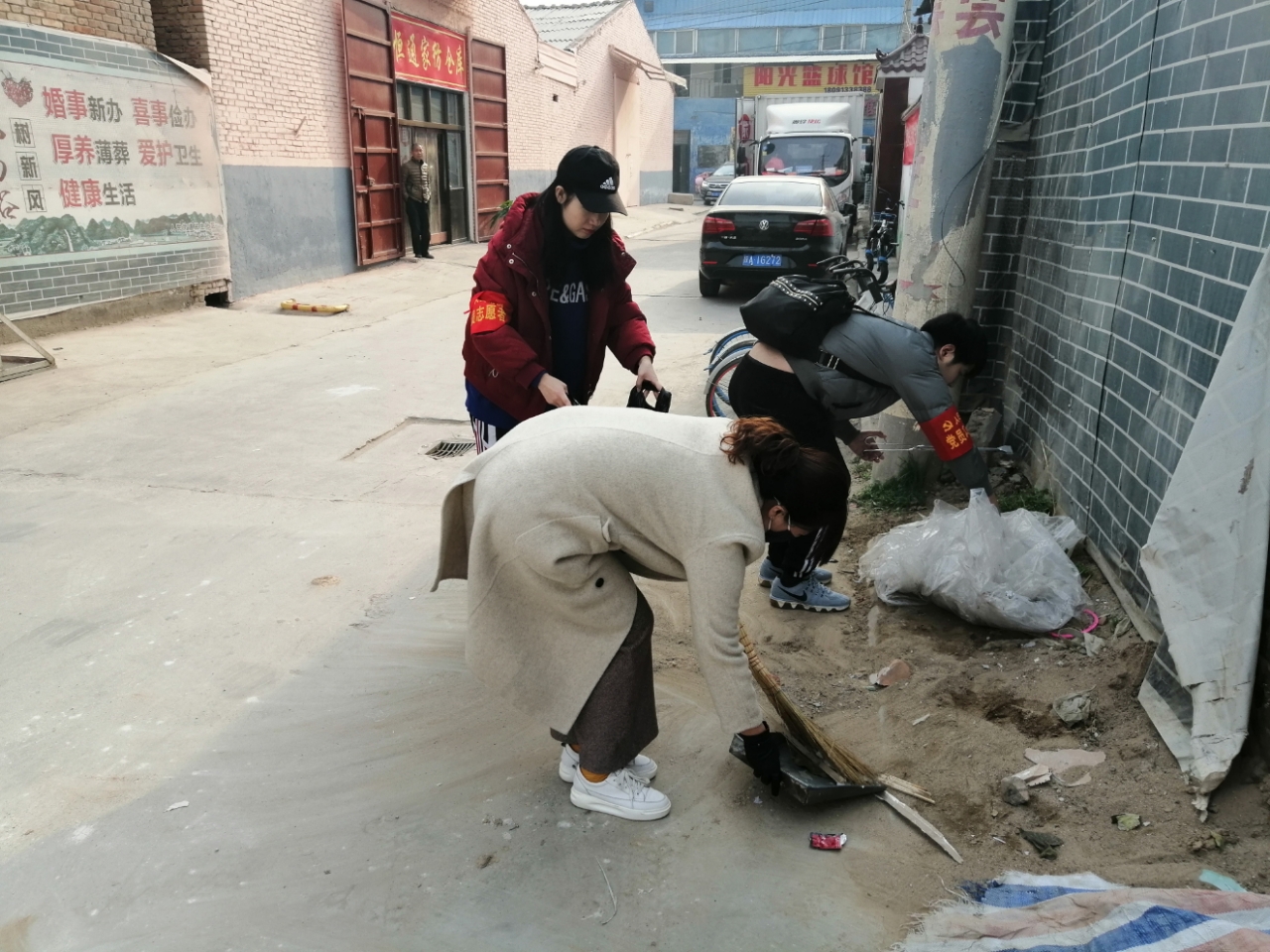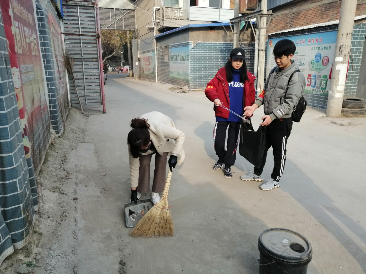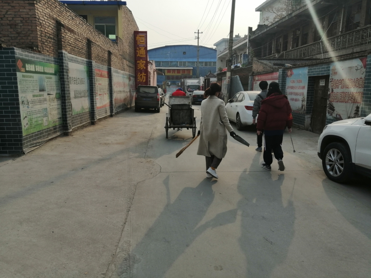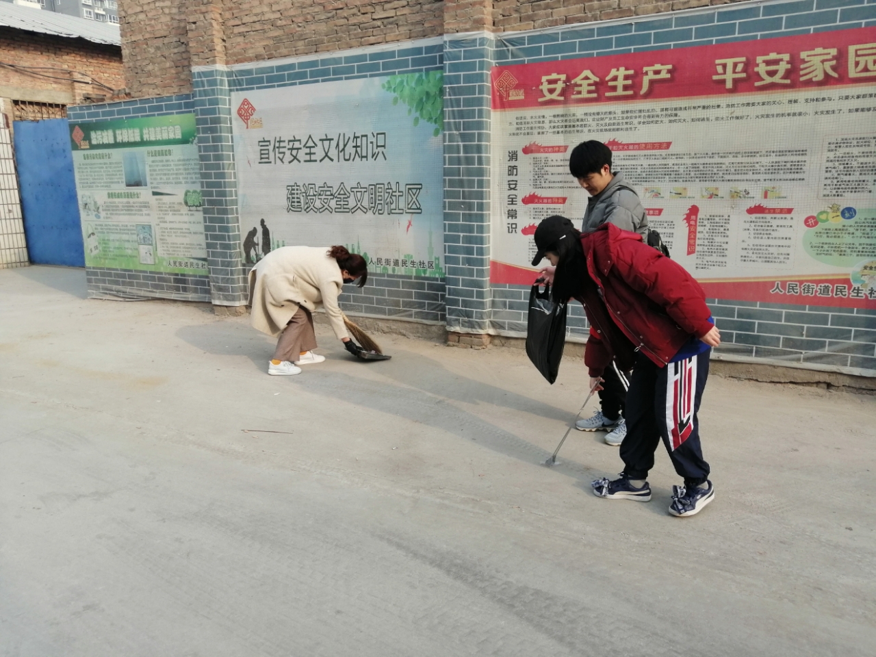 社区工作人员与人保财险渭南分公司党员志愿者共同清扫无人管理巷道卫生。