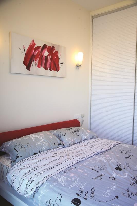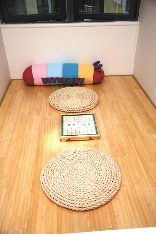 浅卡其色墙面,中性色的竹地板,点缀局部酒红色。使空间明快且丰富、生动。
