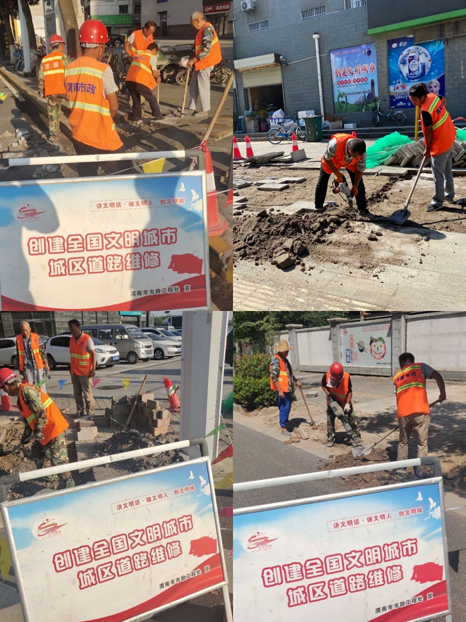 在渭南创文工作进入攻坚冲刺阶段,市政工程处作为城市建设的主力军,举全力冲锋在创文工作第一线,单位领导高度重视,全面动员、全员参与、全力创建。紧抓城区人行道花砖维修、黑色路面维修、井盖更换维修、重点工程项目建设、道路乱开乱挖、空中缆线乱搭乱接等现象,进行集中维修和治理,全力打好这场硬仗。