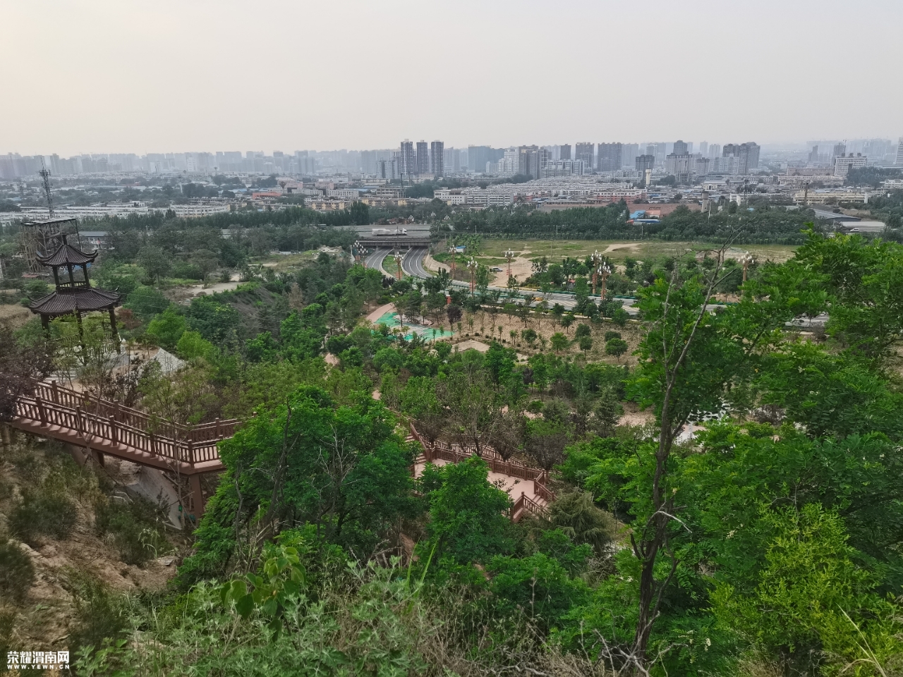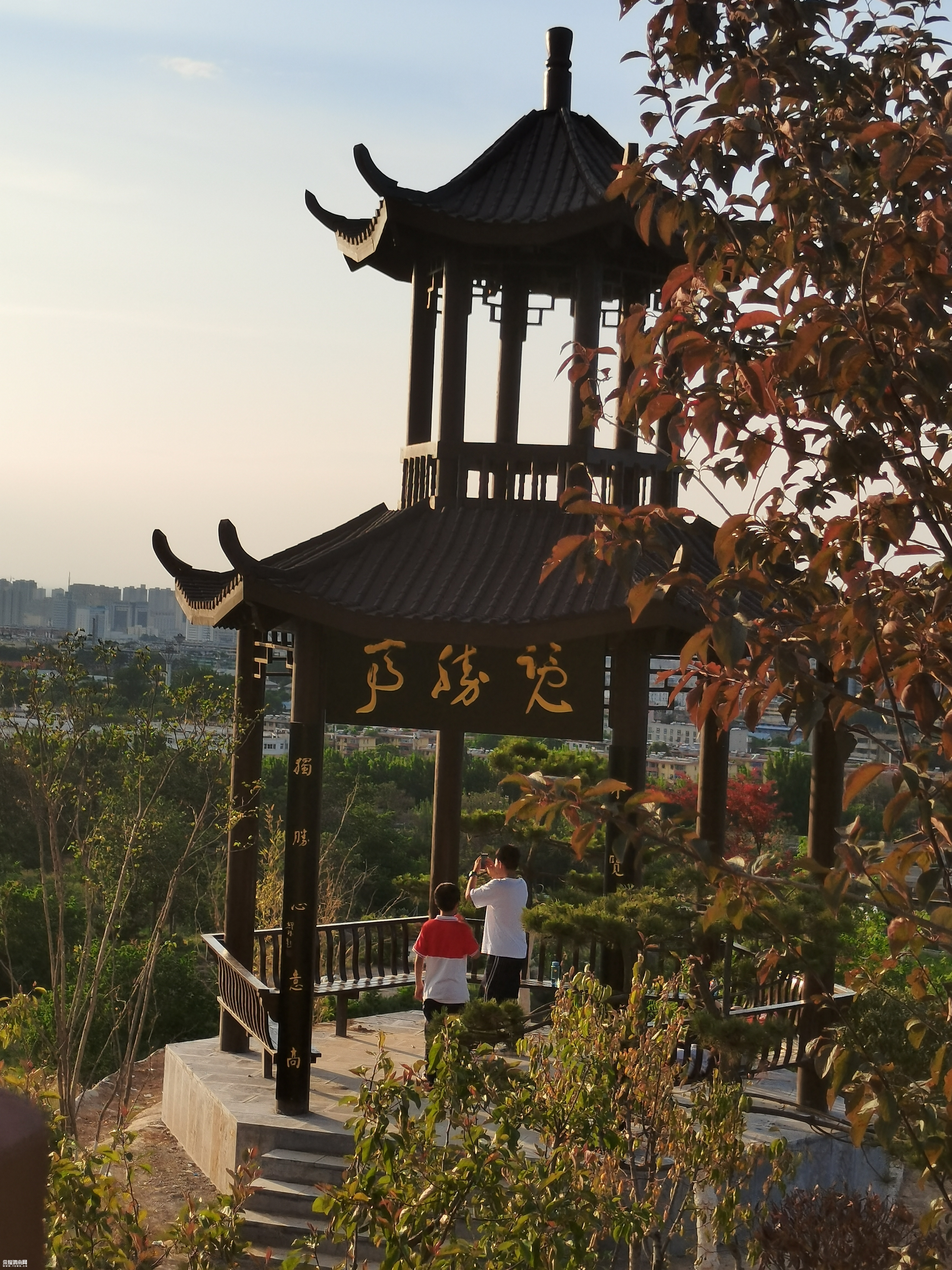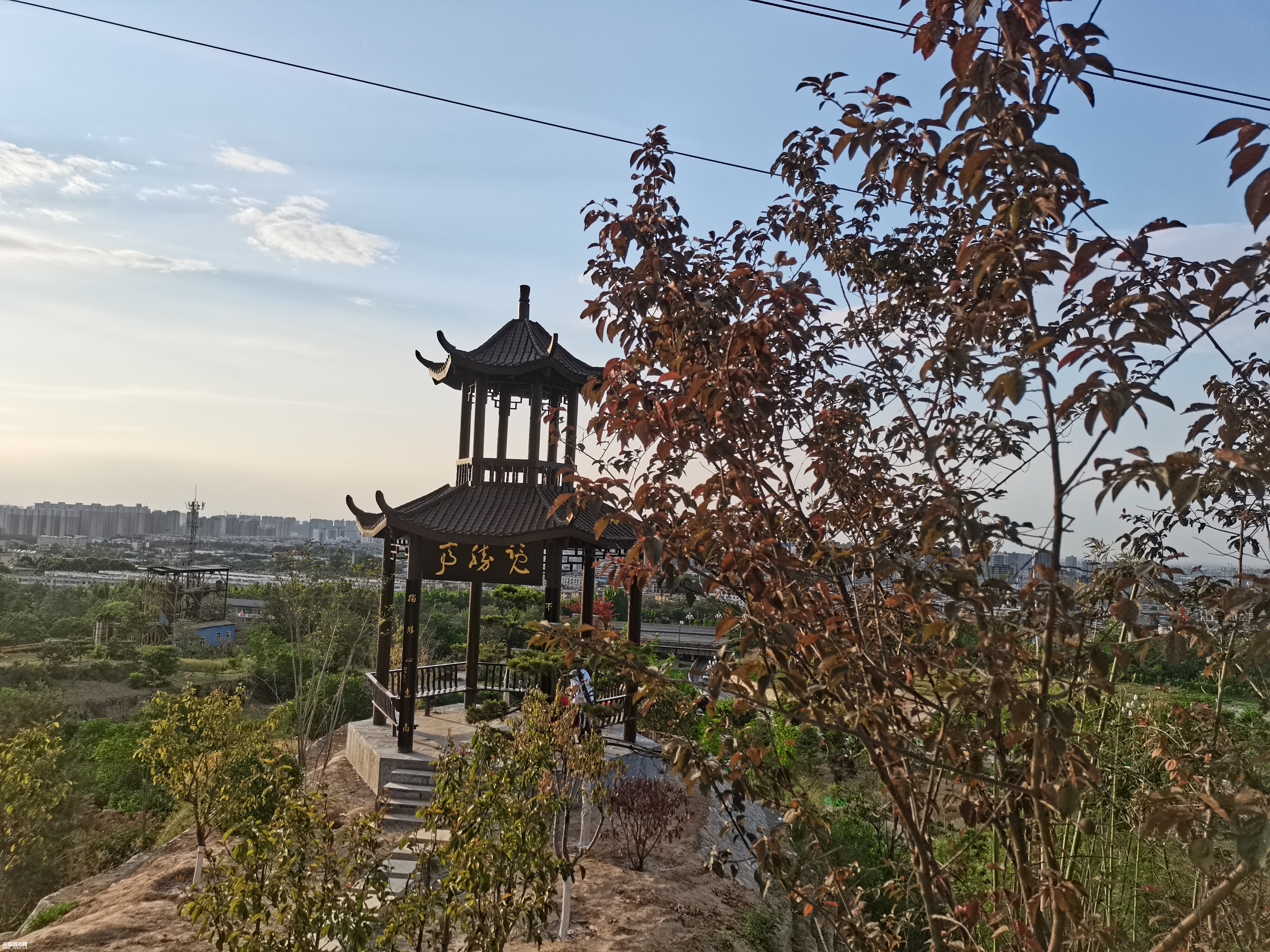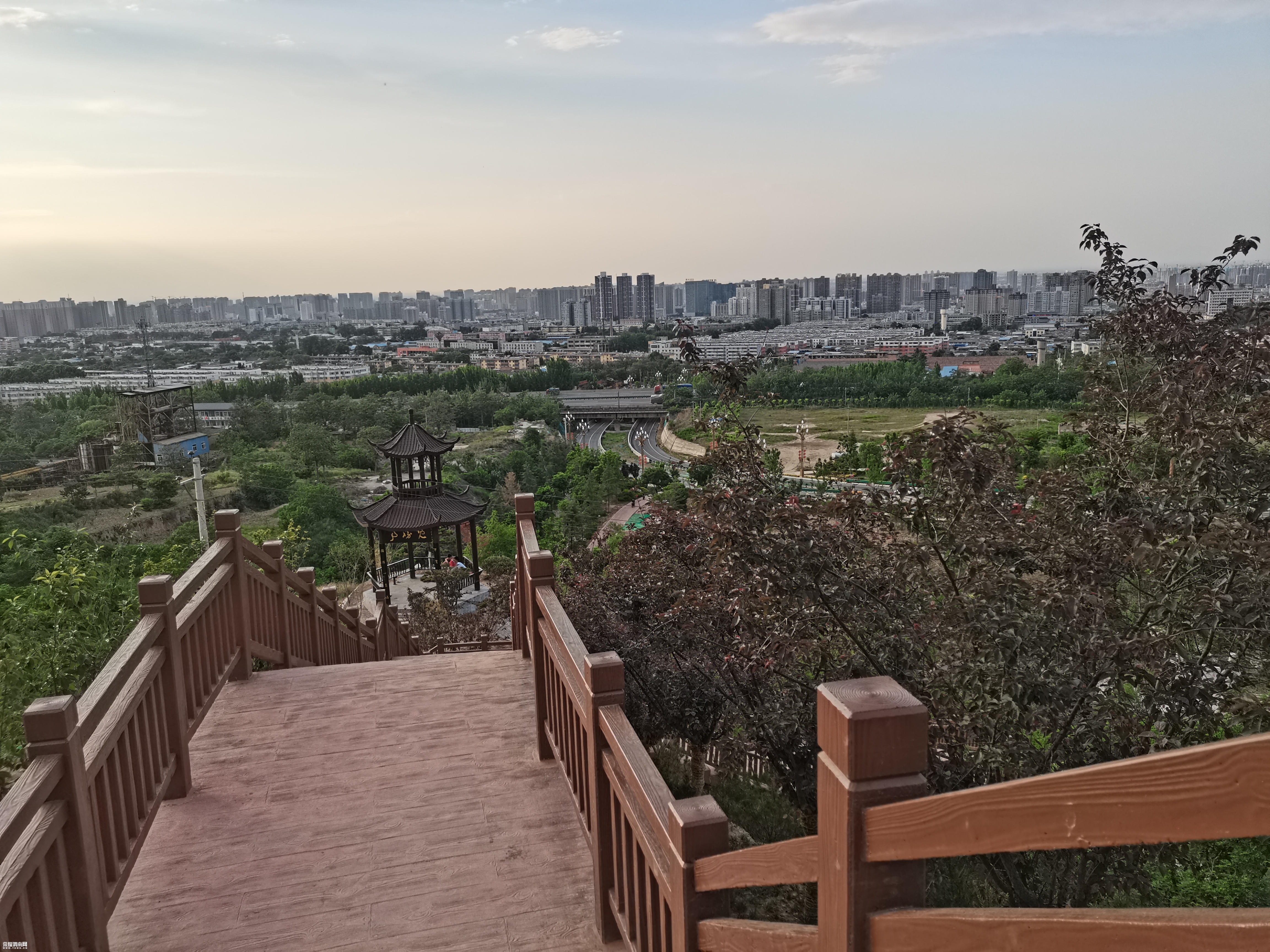 站起来拿起手机拍照时,一下子惊呆了,八百米秦川大渭南雾茫雨中的海市蛰楼的景观。顾不上阁楼的匾牌的书写,快速的来到凉亭的当中,感受杜甫的《望岳》岱宗夫如何?齐鲁青未了。造化钟神秀,阴阳割昏晓。荡胸生曾云,决眦入归鸟。会当凌绝顶,一览众山小。学艺不精冒出·层见叠出渭水情,只愿其中不知景。夕阳学年见蜗居,老腔八卦秦川影,学着古人的步伐,拥抱·转圈·欢呼幸亏下雨没人,要在平常,百分之90的人认为精神不正常,另眼看待远远地躲开。