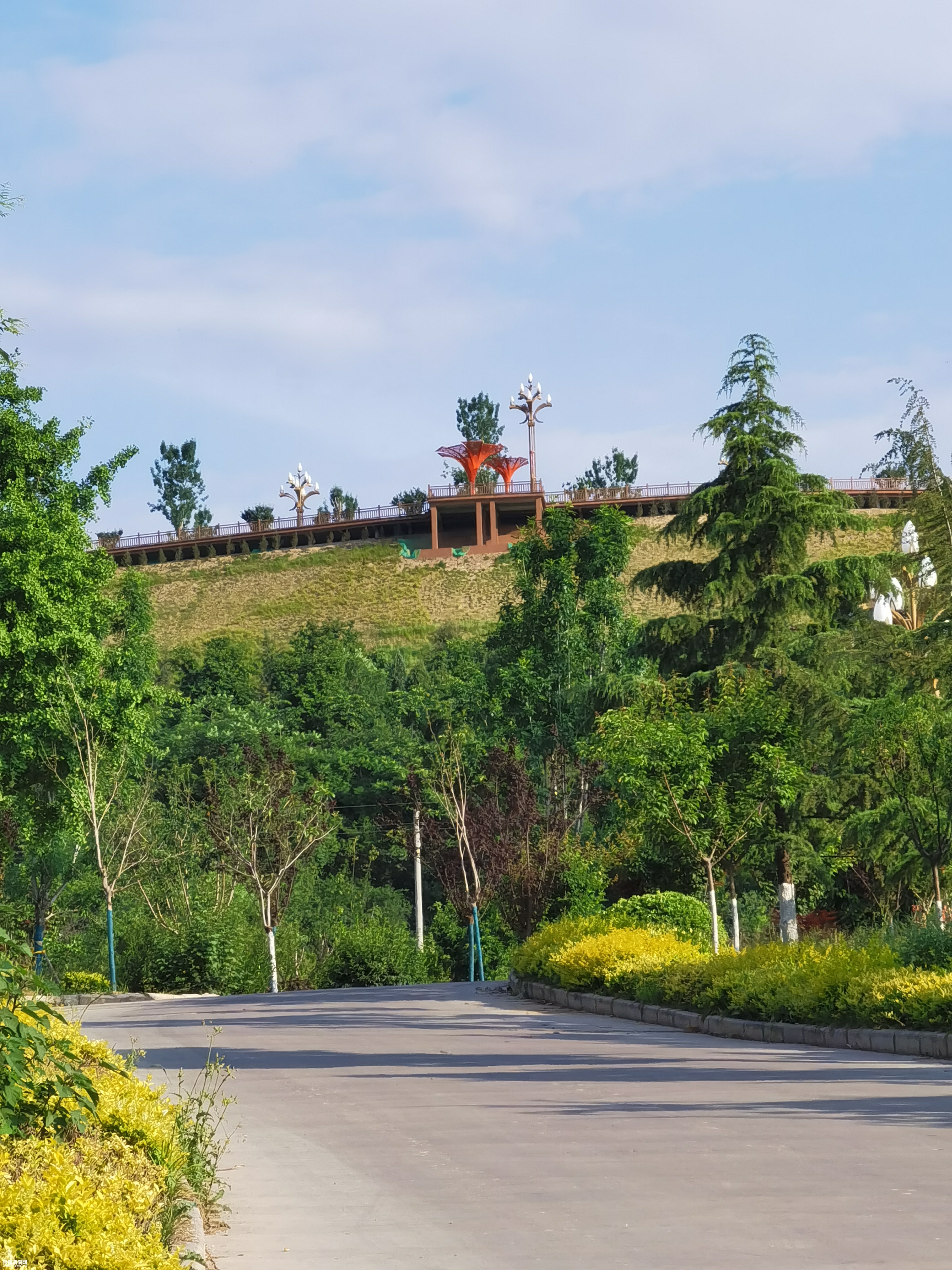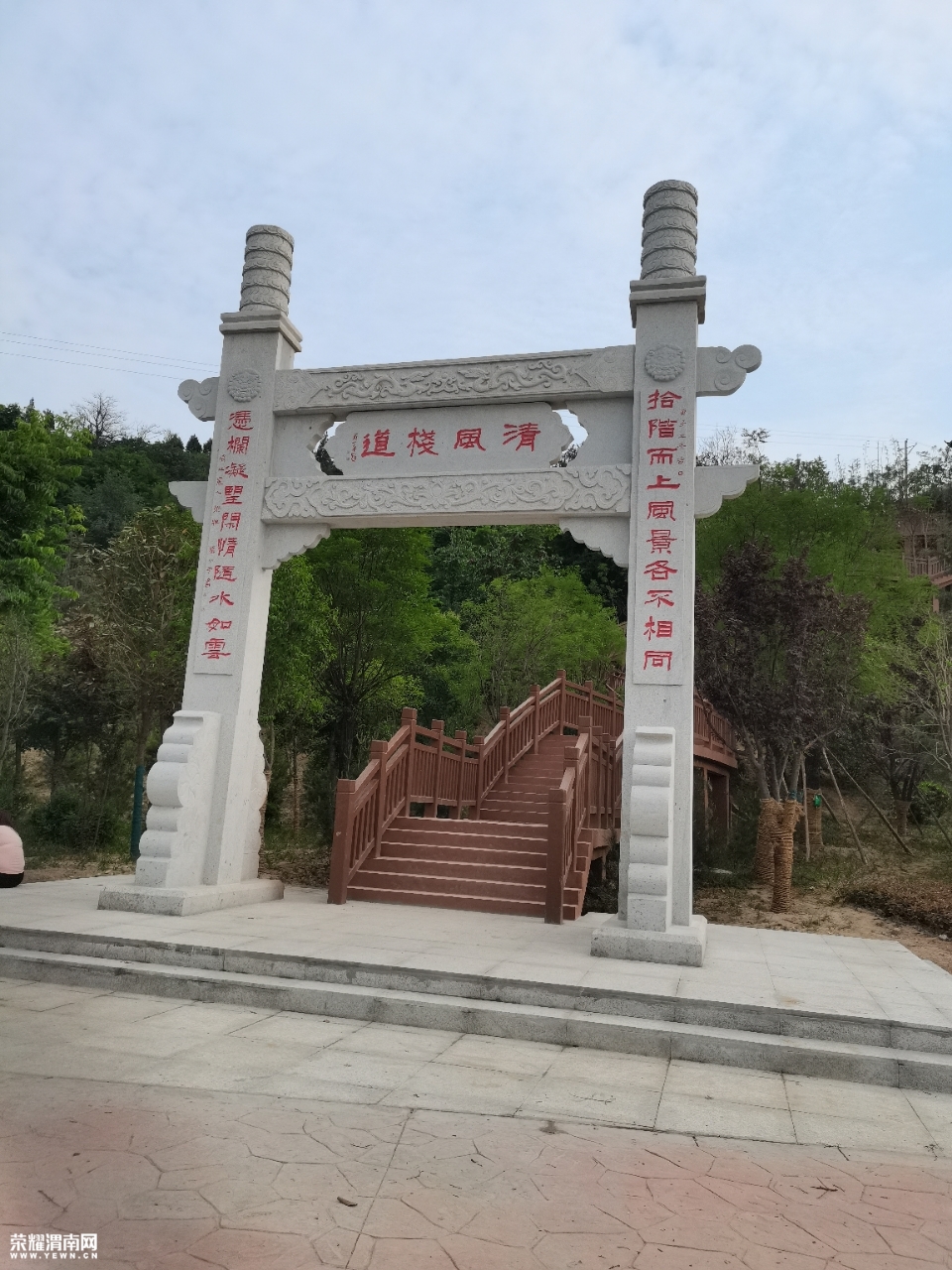 上路一分钟拐弯处,无意看到右侧高处有一座凉亭,六姑泉的亭?慢慢的加马力上坡,以前没有看到呀,没心在上南塬溜达,转头来到了亭的方位,看到竖立在眼前的清风栈道门楼,工人们正在做最后的收尾,台阶的拐弯处,有一队穿着红色T恤的大部队,大联唱没有共产党就没有新中国·游击队之歌·东方红·我爱北京天安门,战士打靶归来等经典红色歌曲。天热人多,忘了拍照转身回家。