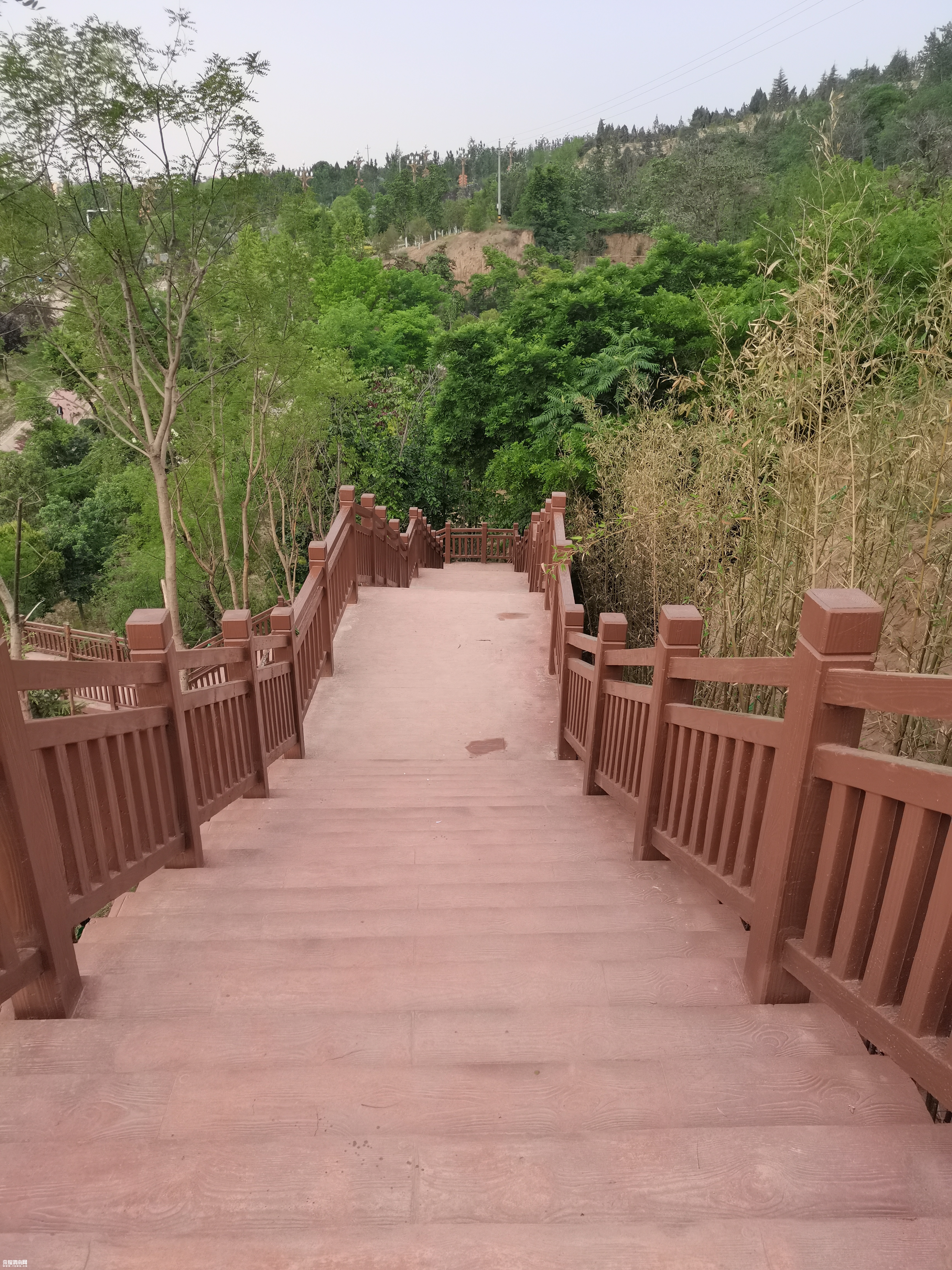 上坡容易下坡难,但你觉得下台阶关节受不了,沿着红色的水泥路,环亭而下,绕坡而行,一路的美景会是你再一次的来到台阶的阁楼,迷恋的清风栈道。