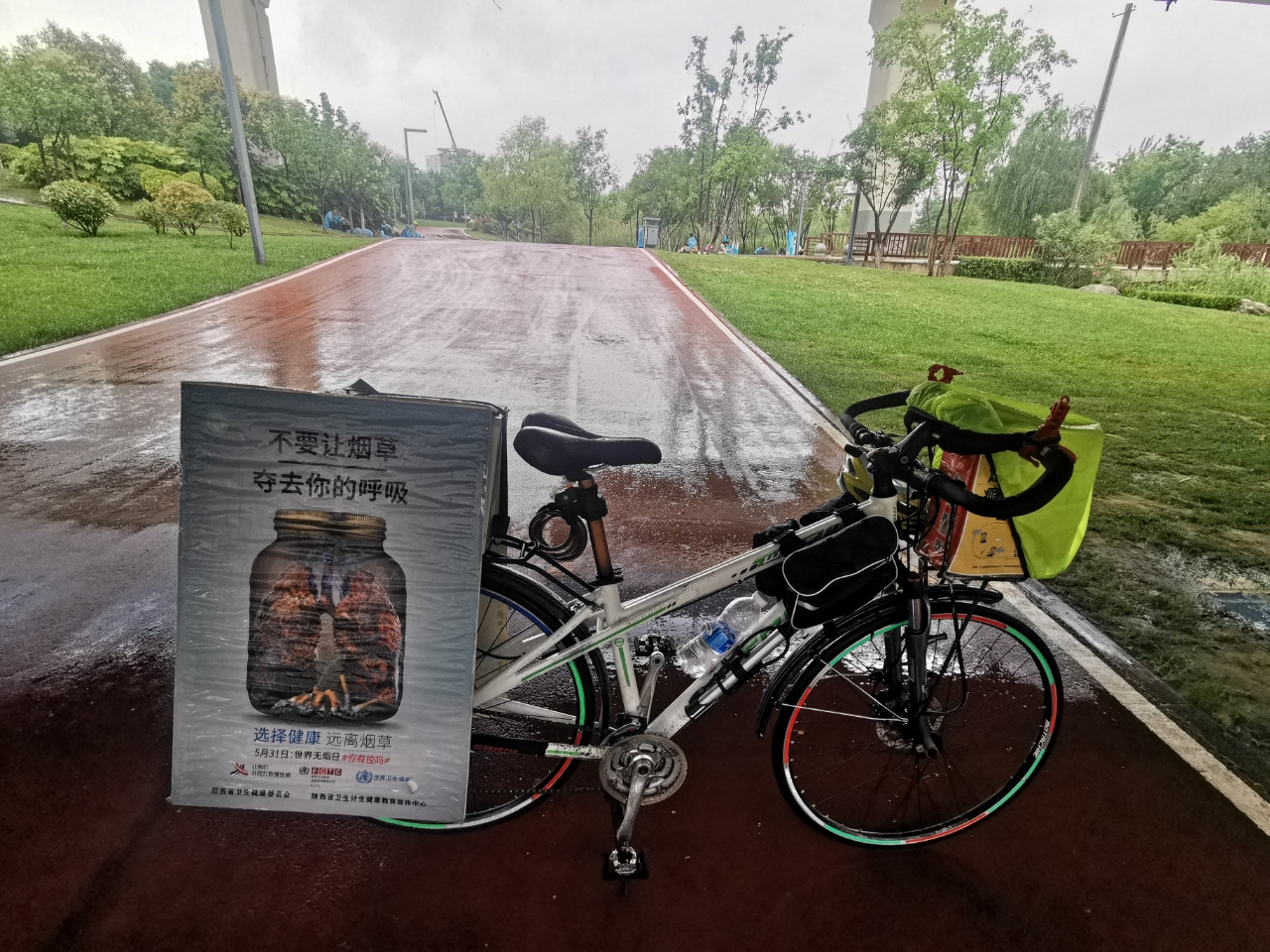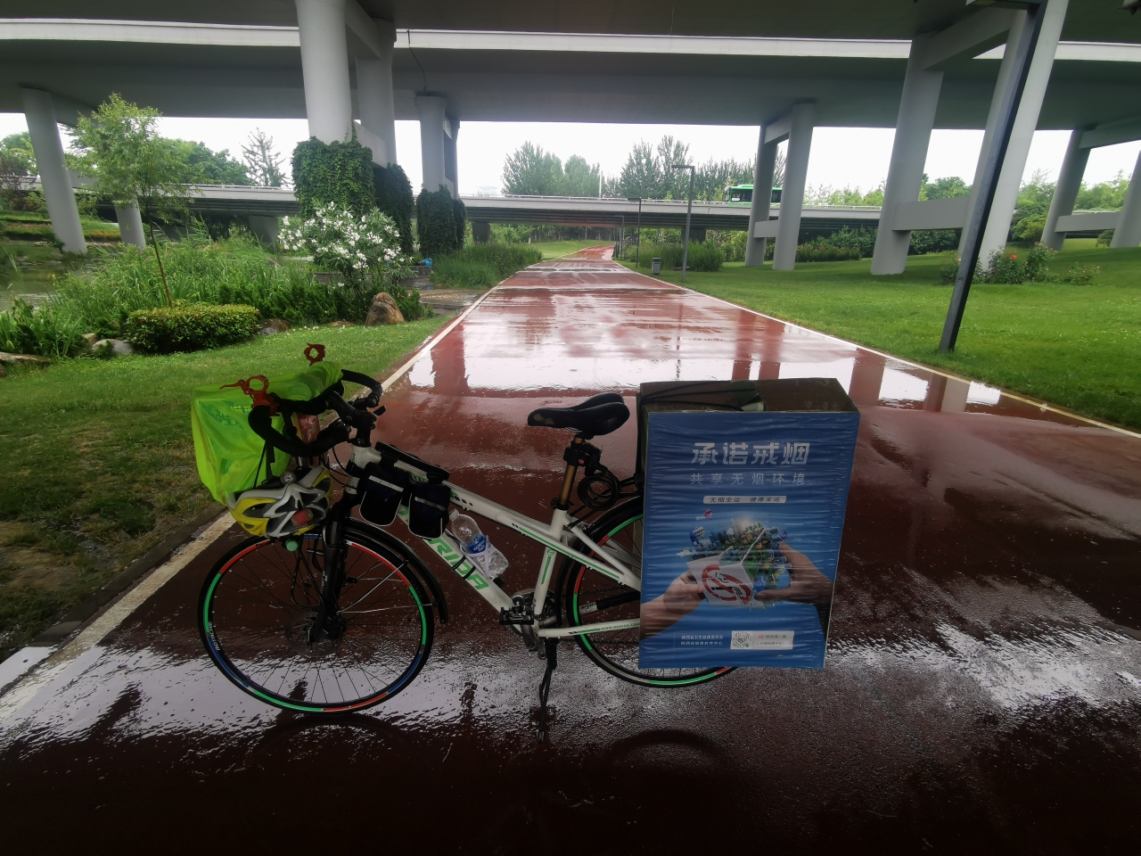 昨天是端午节,上午骑车回渭南,走到灞桥时雨下得哗哩哗啦,本想着下一阵子应该就不下了,谁知道在铁路桥底下等了好久还是下个不停,一会儿大一会儿小的,于是穿上雨衣,把手电音响充电宝等小电器装进塑料袋再裹上防水罩,趁着雨势小一些就赶紧走了。