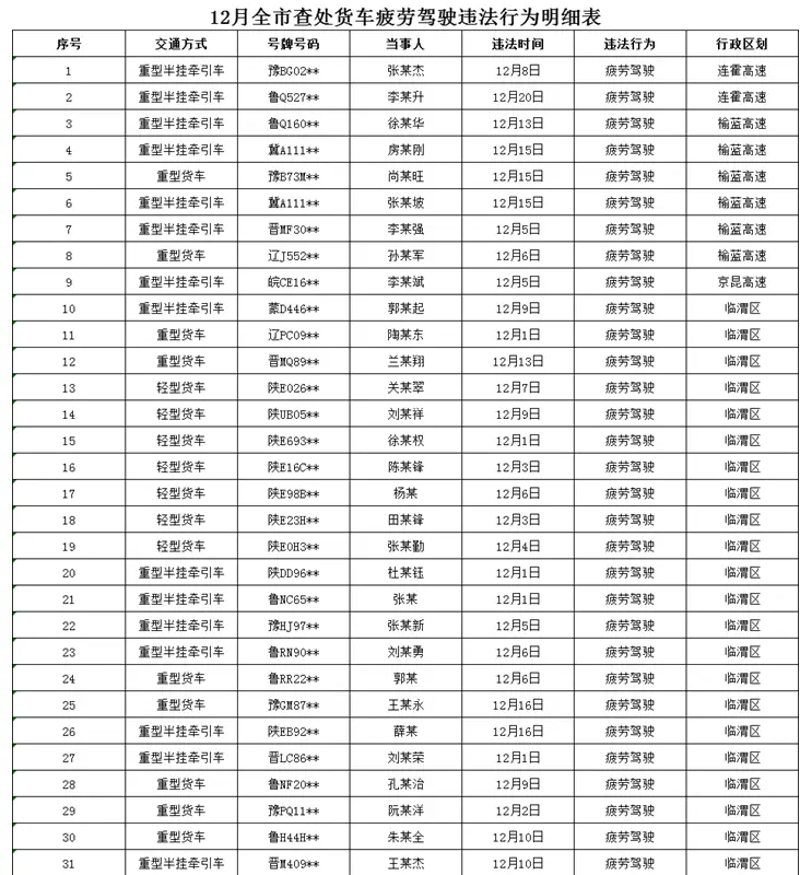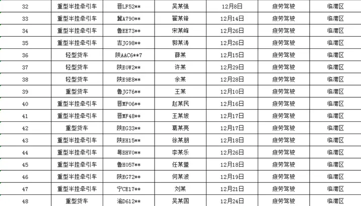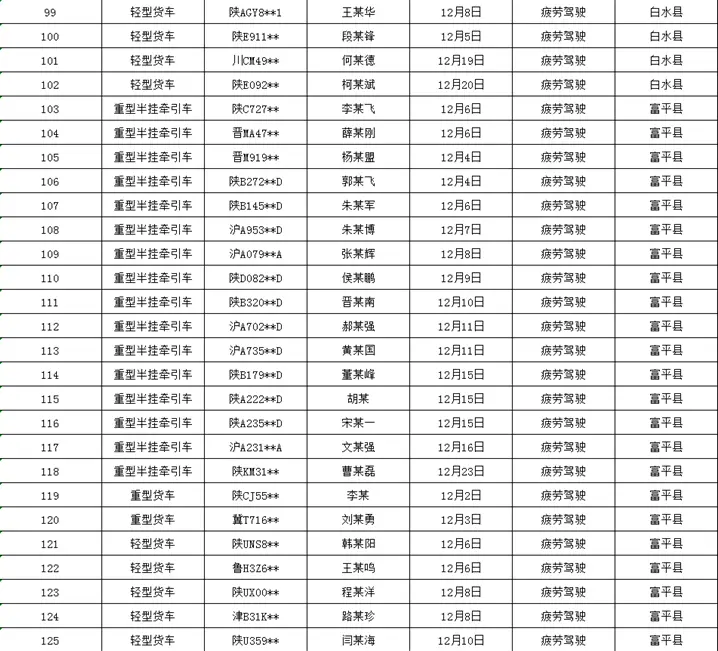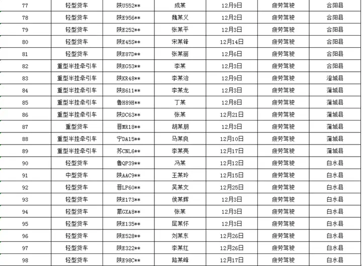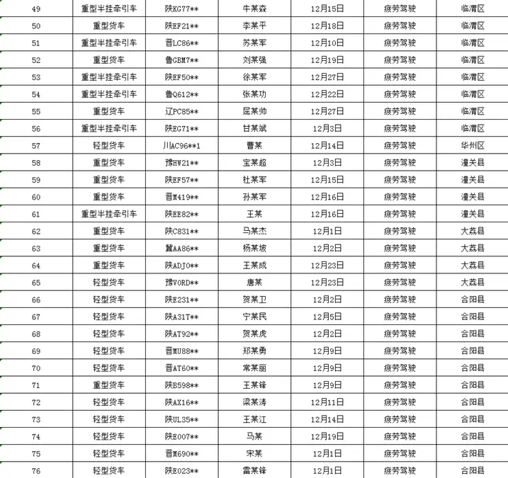 元旦将至,为有效维护道路交通环境安全平稳,确保人民群众平安出行,节前渭南公安交警针对各类易肇事肇祸的严重交通违法行为进行严查严处,现将近期查处的疲劳驾驶交通违法行为人名单予以曝光,希望广大交通参与者引以为戒。
