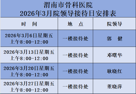 为了推进现代医院管理内涵建设,持续改善患者就医体验,深入推进院领导“下基层”工作,建立健全医院领导与患者面对面沟通解决问题的工作机制,发现、解决和持续改善医疗服务全流程中存在的堵点难点,按照《渭南市骨科医院院领导接待日制度》要求,现将我院2026年3月院领导接待日具体安排通知如下:每周五上午8:00--12:00。(遇节假日顺延至下一工作日) 院子一楼接待室。 门诊、住院患者及家属,医院职工,社会各界人士等。 群众对医院在质量、安全、效率、服务、医德医风建设、党风廉政建设、行风建设、环境卫生等方面的意见及建议;医院职工的诉求及建议等。为合理安排接待流程,尽量减少来访患者群众等待时间,采取电话预约或现场接待形式进行登记,根据预约先后确定接待顺序,无预约者视当日情况登记或接待处理。接待须知:来访对象自觉服从工作人员安排,反映事项应当客观真实,不得捏造、歪曲事实,不得诬告、陷害他人,反映问题有理有据,不妨碍医疗秩序和医院正常工作,感谢配合。