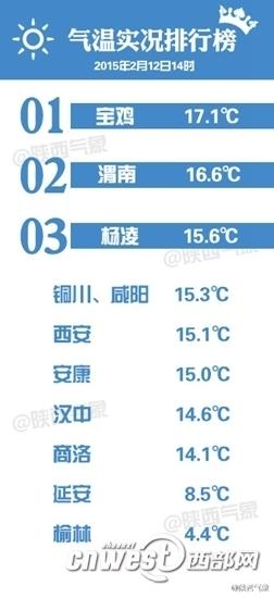 截至12日14时,陕西的最高温出现在宝鸡,已经达到了17.1℃.(图片来自“陕西气象”) 西部网讯(记者 秦振) 还有不到一个星期就过年了,而最近陕西地区的天气也是真真体现出了“年味”,火热的天气就像是映衬人们的情绪一样,连续多天关中、陕南都出现了15℃以上的高温。 而据记者从陕西省气象台了解到的最新情况,整个春运(2月4日-3月15日)我省大部分地区气温较常年同期偏高0~1℃。预计2月上、中旬有2~3次雨雪天气影响我省。2月下旬后影响我省的冷空气势力减弱,气温回升较快。全省大部地区降水偏少。 全省57个县城最高温超15℃ 森林火险等级高 11日,整个陕西似乎都躺在了冬日的暖阳里,气温大幅上升,关中、陕南共57个县城最高气温超过15℃,最高眉县20.6℃,西安泾河17.2℃;吴起、户县、咸阳西部、陕南部分地区出现轻雾,关中地区的9个县城有霾。 今天早晨最低气温(截止07时)分布中,陕北大部-9~-4℃,最低富县-9℃;关中大部、商洛-5~3℃(西安泾河1.8℃);汉中、安康-4~3℃。 据11日17时发布的森林火险等级预报显示,12日延安南部、关中大部、商洛森林火险等级为5级(极度危险),榆林大部、延安北部、关中部分地区、汉中北部、安康森林火险等级为4级(高度危险),提请相关部门需注意防范。 春运期间有2-3次雨雪过程 整体形势偏好 从实际情况来看,最近这段时间,陕西天气条件总体趋好,这对于广大准备回家过节的人们无疑是一个利好消息。 记者了解到,春运期间,天气影响较小,但需重点关注天气阶段性变化的影响。2015年春运正值冬春转换时段(2月4日至3月15日),是低温、雨雪、大风、雾霾等气象灾害的多发期。常年春运期间全省平均气温为3.2℃,降水量18.4毫米。今年全省气温偏高,但阶段性明显。 预计2015年春运期间,我省大部分地区气温较常年同期偏高0~1℃。预计2月上、中旬有2~3次雨雪天气影响我省。2月下旬后影响我省的冷空气势力减弱,气温回升较快。全省大部地区降水偏少。 预计春运期间陕北、关中总降水量3~10毫米,陕南10~15毫米,较常年同期偏少2~3成。由于冷空气弱,气温偏高,发生大范围持续性低温雨雪冰冻灾害的可能性较小。 未来一周多云为主 18日或迎雨雪 13日:陕北、关中晴天转多云,陕南多云转阴天。 14日:陕北、关中多云转阴天,陕南阴天间多云,部分地区有雨夹雪。 15日:全省阴天转多云,陕北部分地方有5-6级偏北风。 16日:全省多云。 17日:全省多云转阴天,陕南南部部分地区有雨夹雪。 18日:陕北、关中阴天转多云,关中南部部分地方有小雪,陕南阴天部分地方有小雪。 后期天气趋势(2月19日-2月21日):我省以多云或阴天为主,21日全省大部有一次雨雪天气过程。 |